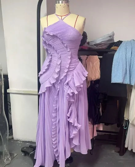 Lunaria Ruffle Dress – Sculpted Pleat Halter Gown