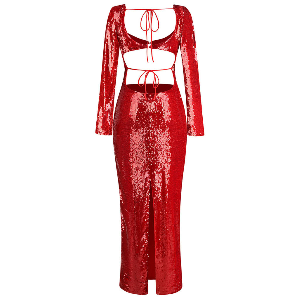 Luxurious Buttoned Bra Top CutOut Sequin Zipped Sleeve Split Maxi Evening Dress