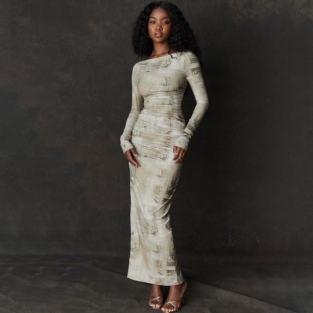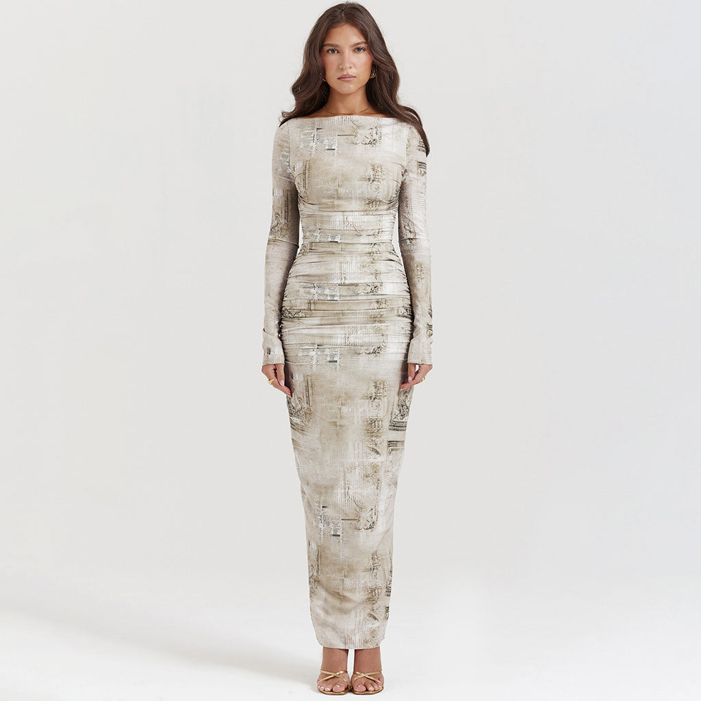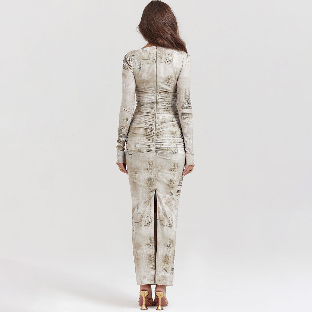 Luxury Boat Neck Ruched Bodycon Split Long Sleeve Blurry Printed Maxi Dress