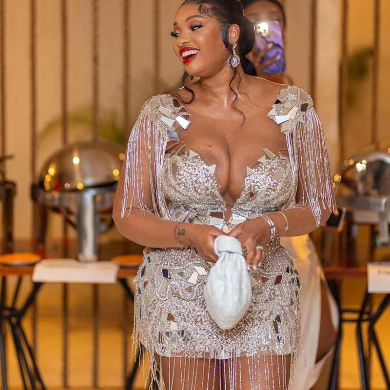 Luxury Crystal Fringe Padded Epaulet Mirror Sequin Mesh Panel Lurex Mini Party Dress