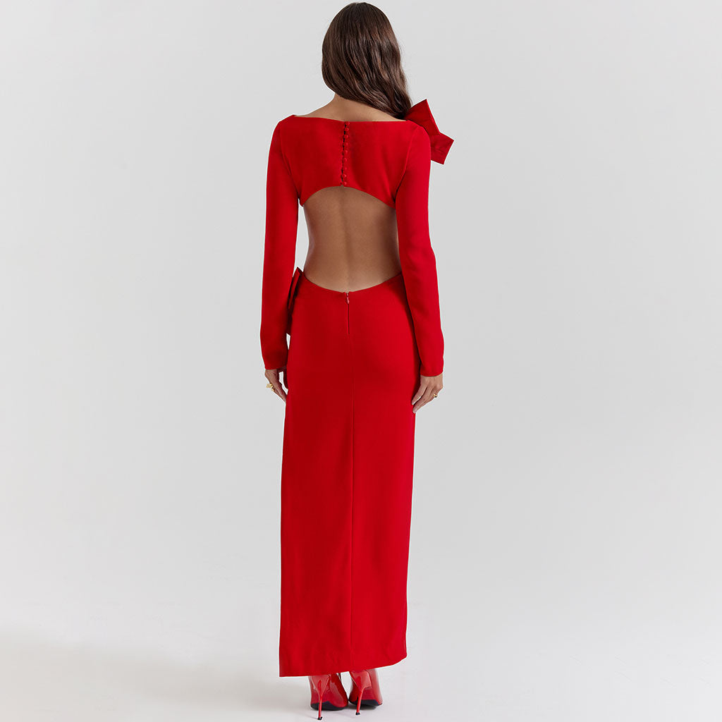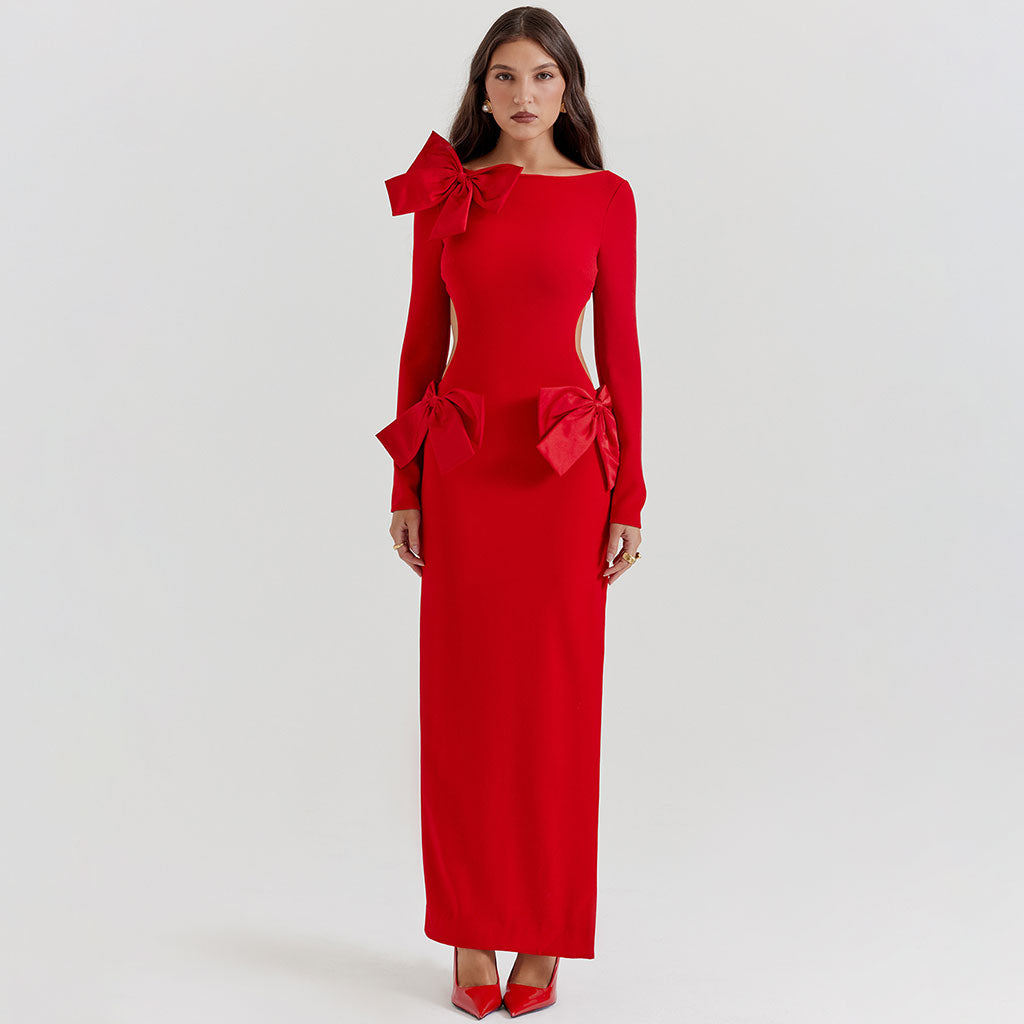 Luxury Oversized Bow Boat Neck Bodycon Long Sleeve Thigh Split Cut Out Maxi Dress
