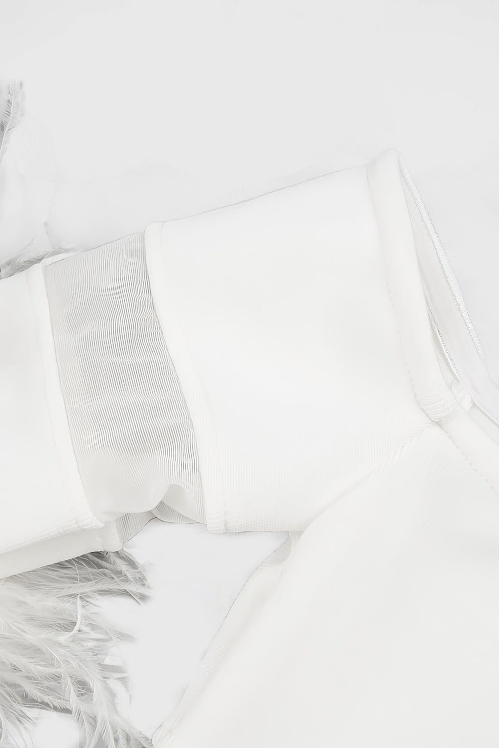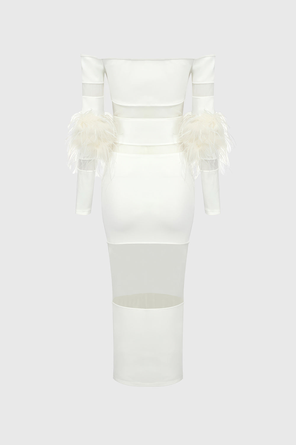 This black midi dress features off-shoulder sleeves and intricate mesh inserts for a modern. chic look. With a hint of feathers at the elbow level. this elegant garment has an incredibly comfortable fit thanks to its stretchy fabric.