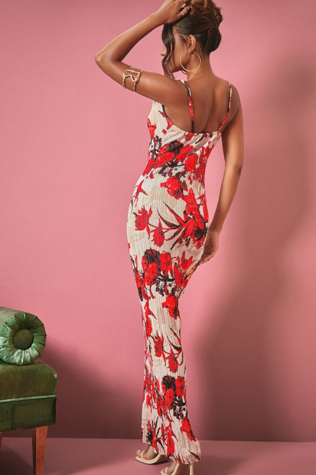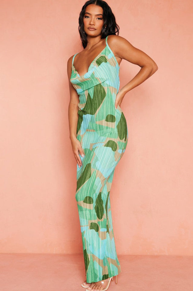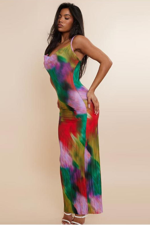 This maxi dress is perfect for any occasion. Featuring a multi watercolour plisse material with thin straps and a maxi length. how could you say no? Wear with bright heels and minimal accessories to steal all the stares.