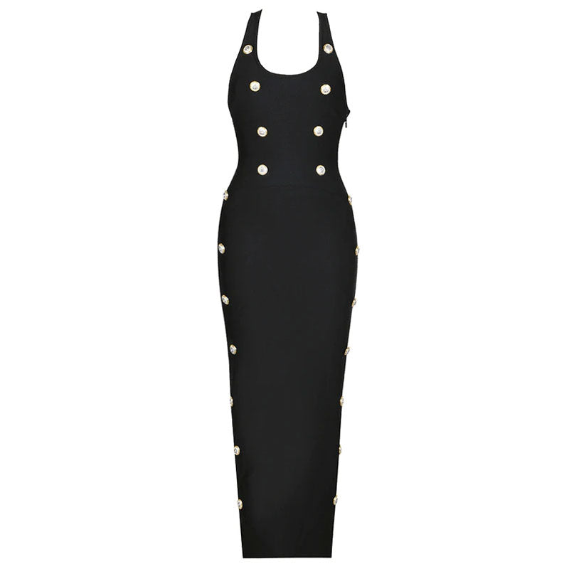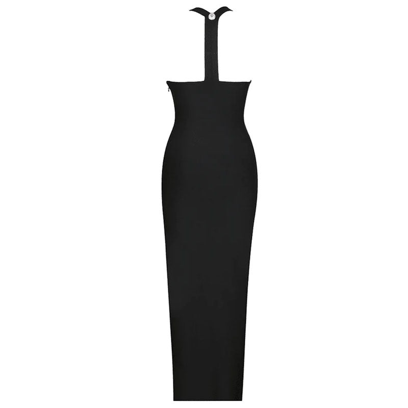 This stunning bandage dress is a perfect blend of nostalgia and contemporary style. The square neckline and racerback design evoke classic Hollywood glamour. The fitted silhouette beautifully accentuates feminine curves. creating a flattering and confident look. Bandage detailing adds texture and pays homage to late 1990s and early 2000s fashion trends. Charming button trims adorn the front. adding a nostalgic touch to the ensemble. The designer maxi gown flows gracefully into a mesmerizing evening length. exuding elegance and poise. A side zipper ensures a seamless fit. adding modern convenience to this retro-inspired masterpiece.