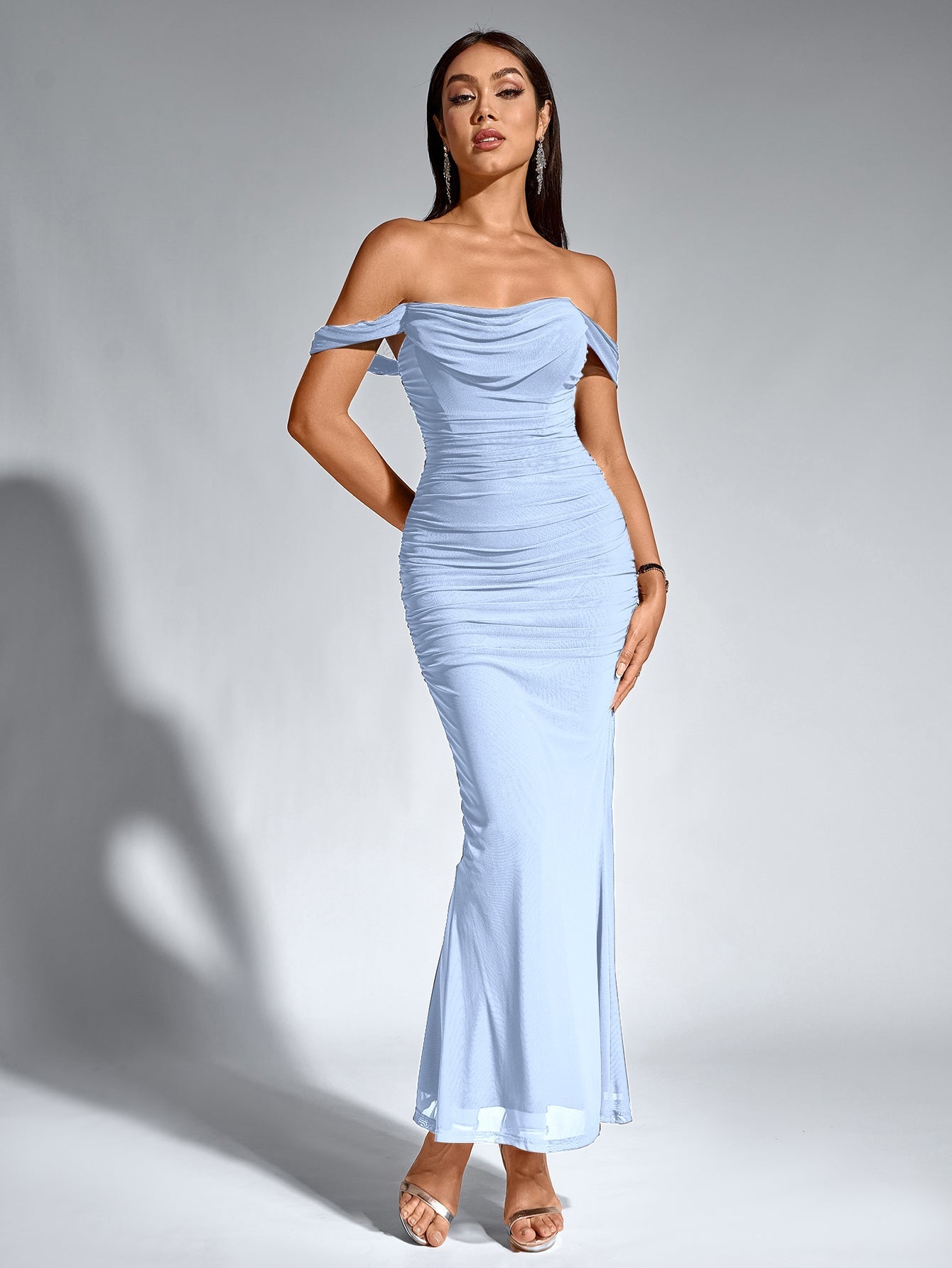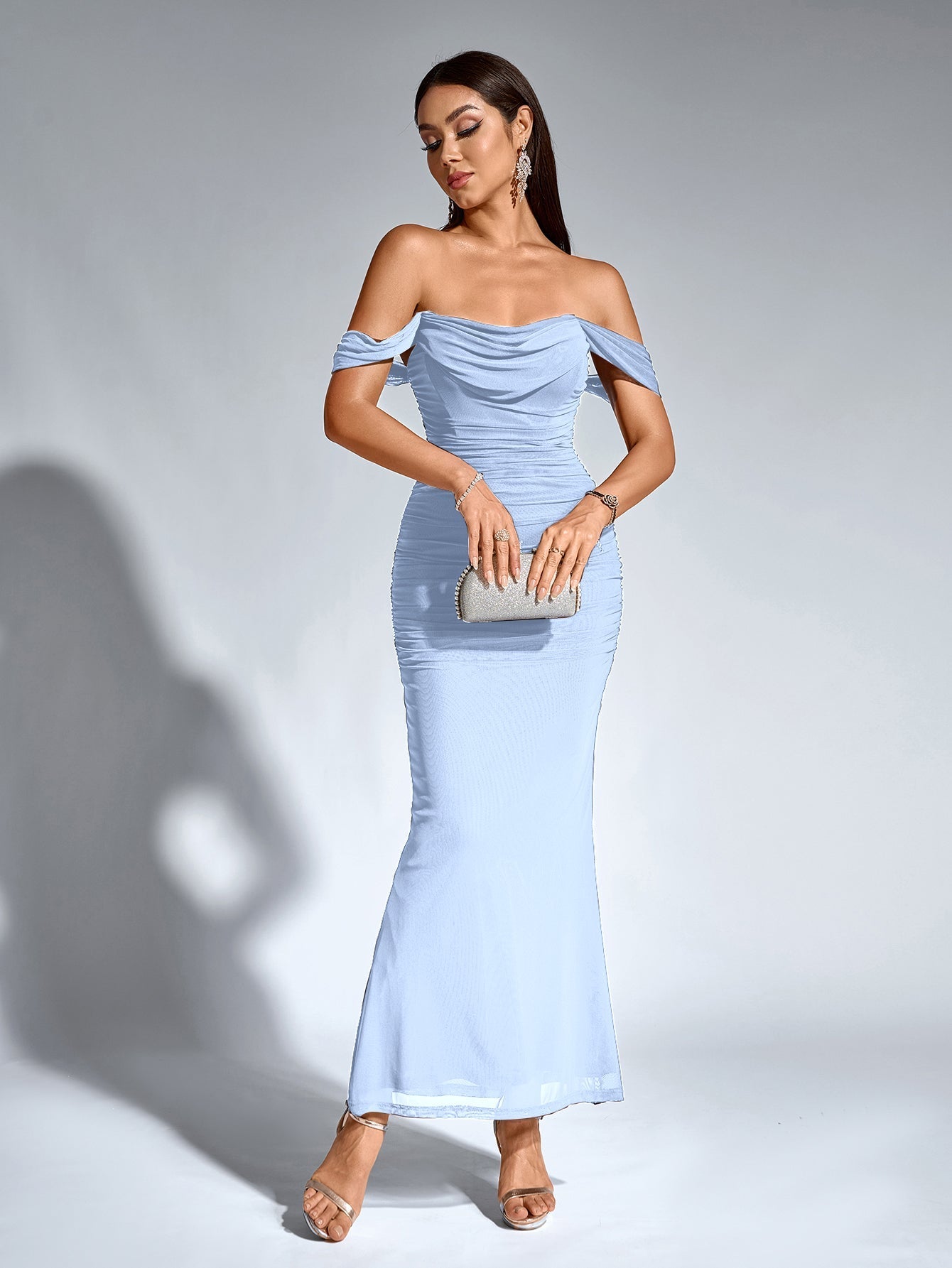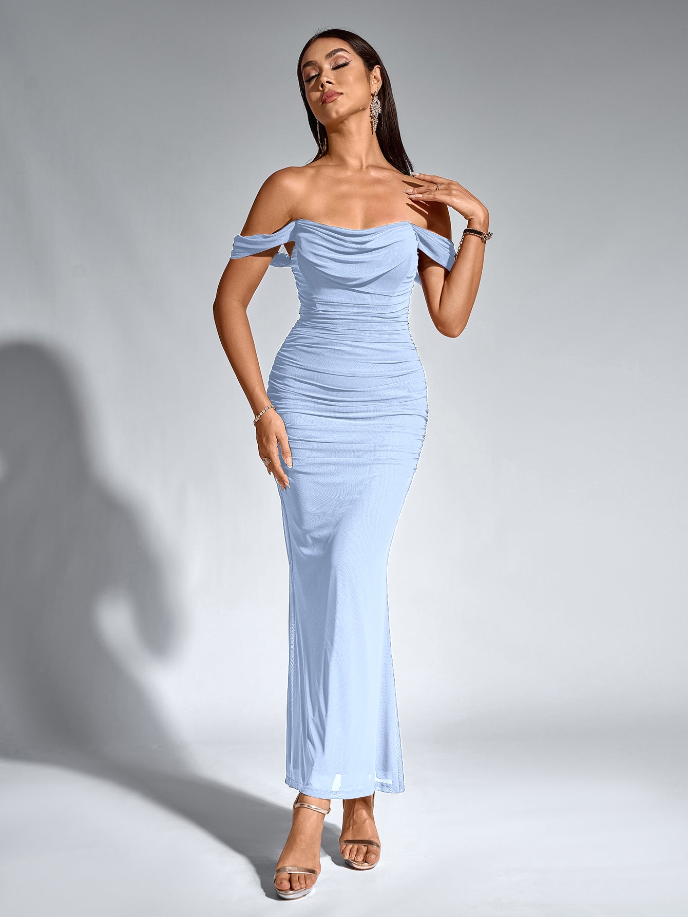 Off Shoulder Ruched Zipper Back Bodycon Dress