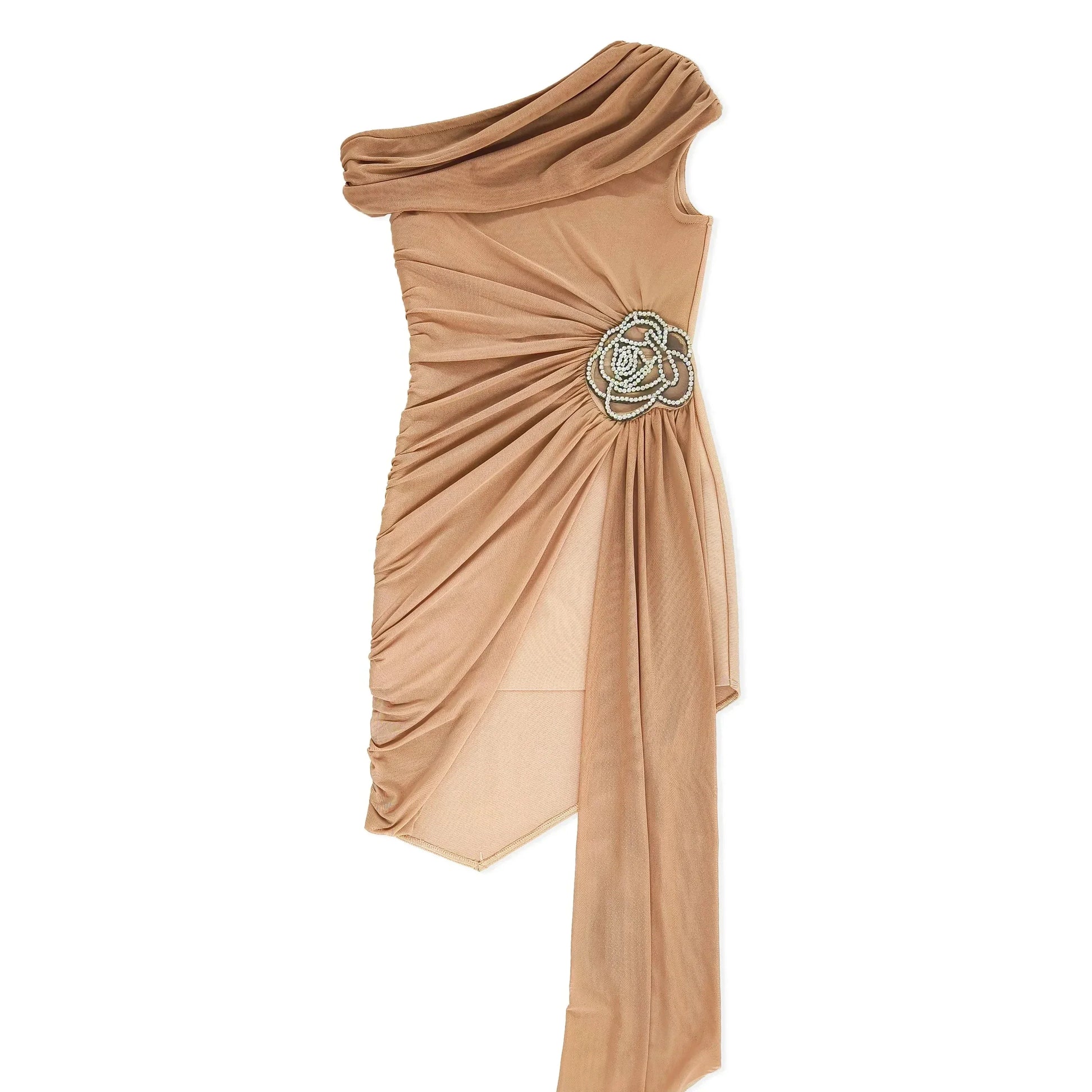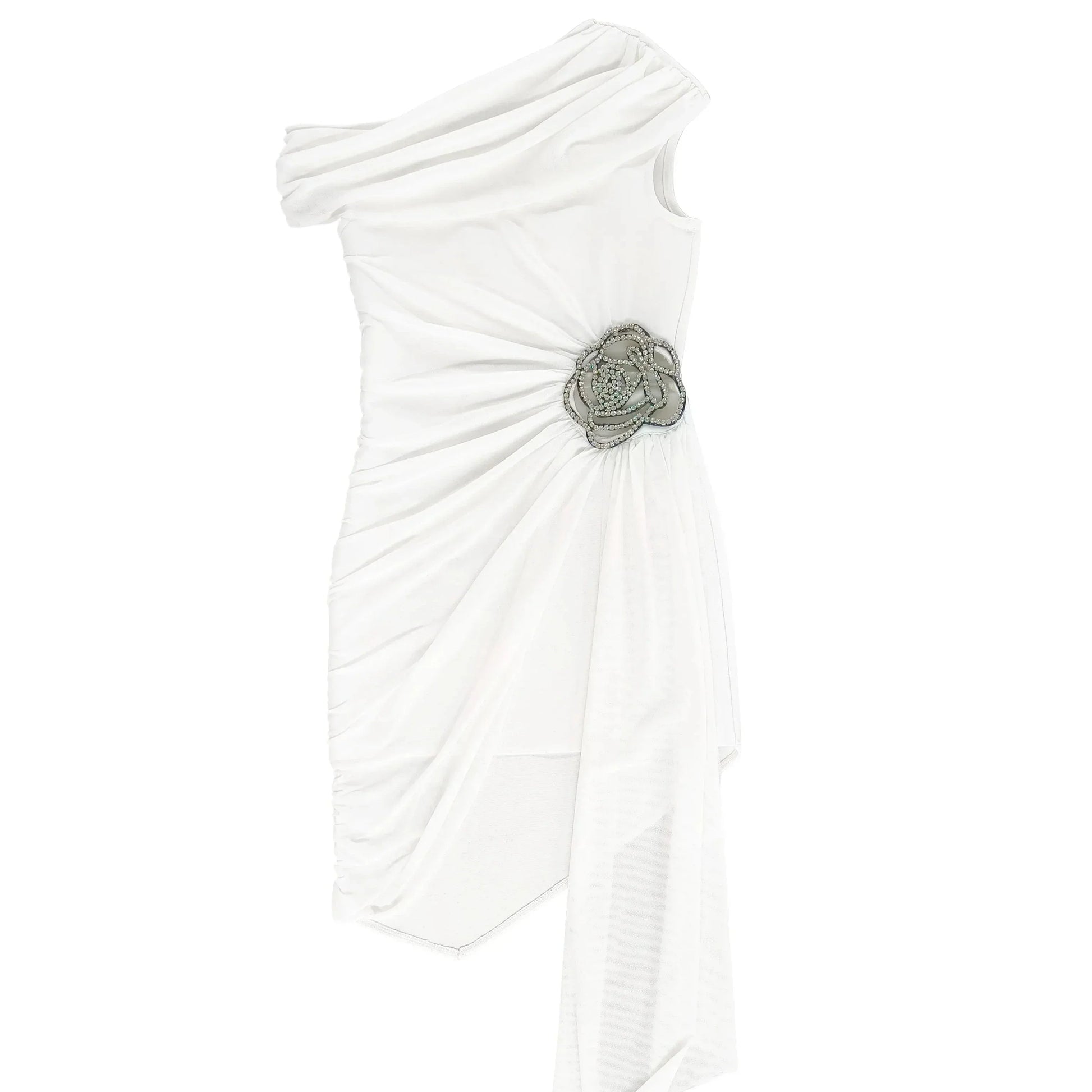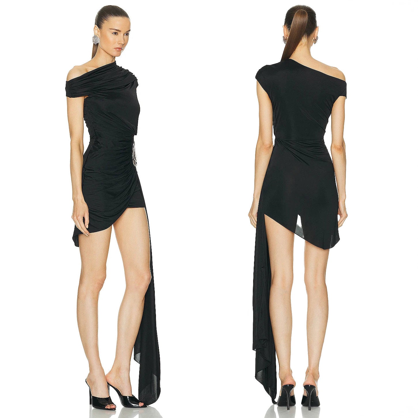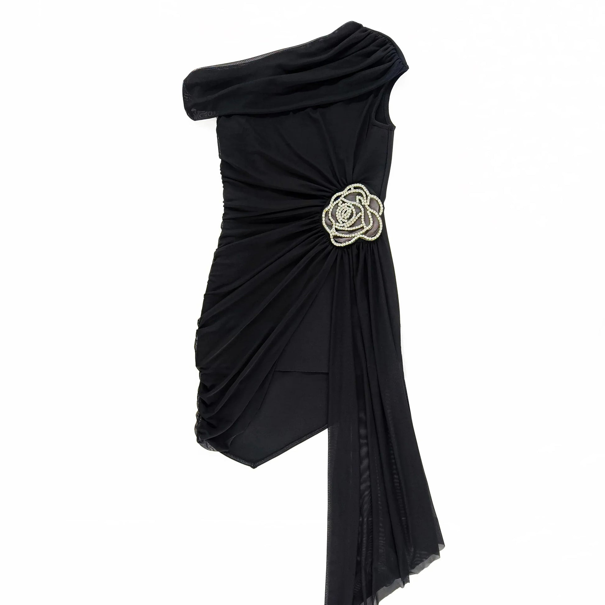 ONE SHOULDER Black Mini Dress with SIDE TRAIN