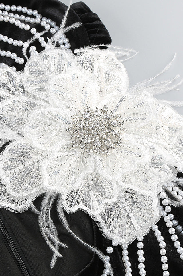 One Sleeve Pearl Floral Maxi Velvet Dress