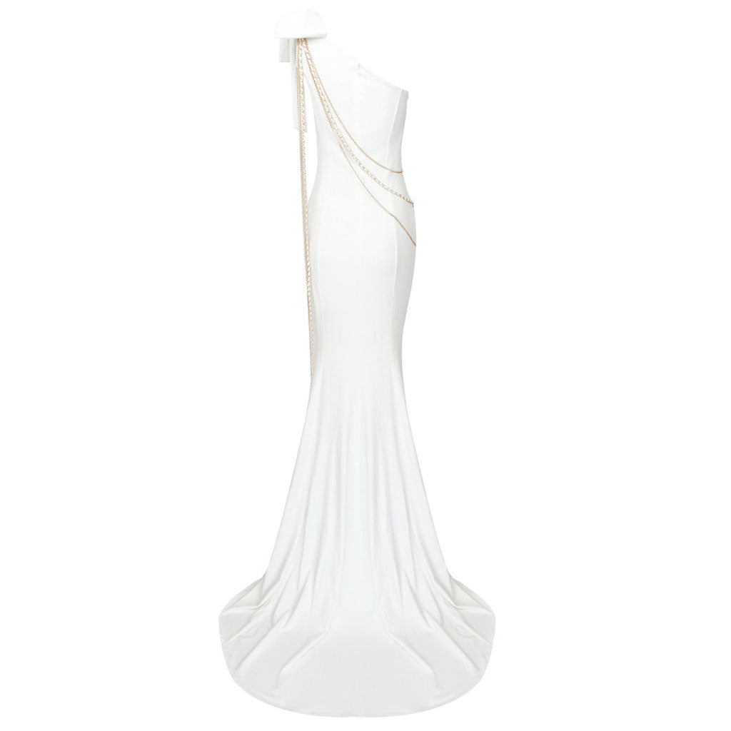 This elegant fishtail gown dress is the epitome of elegance and empowerment. designed to make women feel confidently radiant. Crafted from white stretch fabric. this designer gown dress features an oversized bow on one shoulder. creating a striking asymmetric look. The addition of metallic straps draping effortlessly down adds a touch of modern sophistication. The mermaid-style floor-sweeping hem calls for your favorite pair of stilettos. ensuring you'll command attention with every step. Embrace your inner goddess and radiate grace and confidence with this exquisite gown.