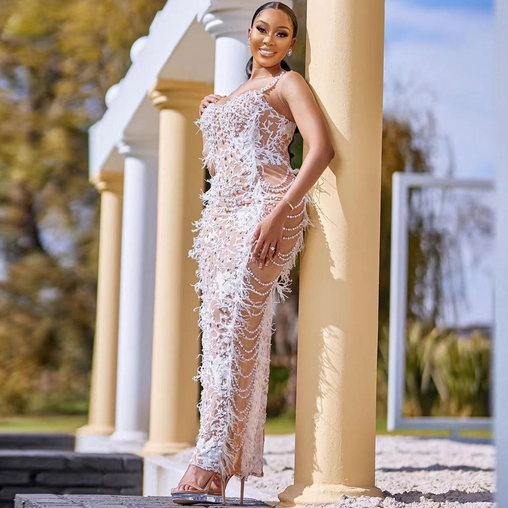 Opulent Pearl Sequined Floral Sweetheart Neck Back Slit Feather Trim Maxi Dress