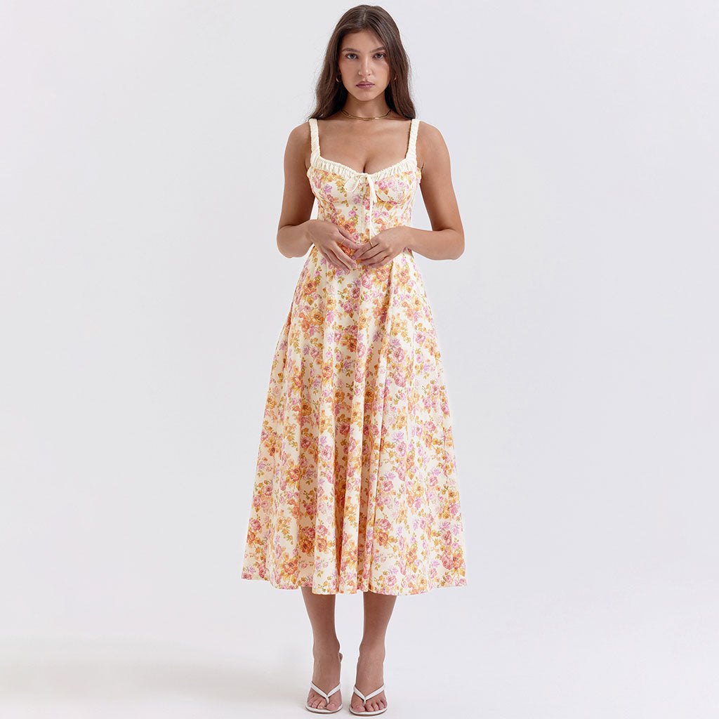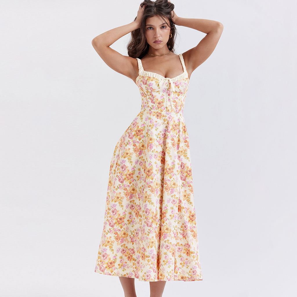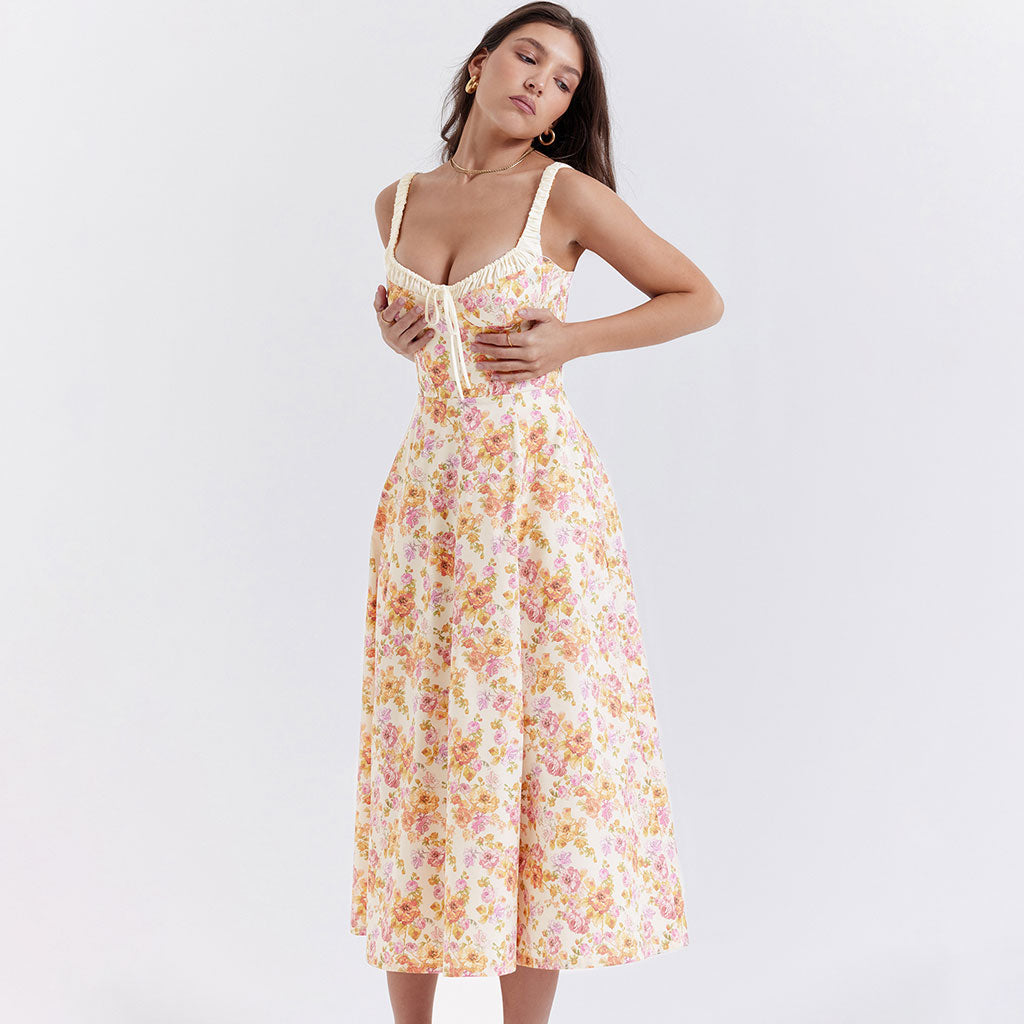Prairie Printed Tie Neck Bustier Ruched Strap Fit and Flare Split Midi Floral SunDress
