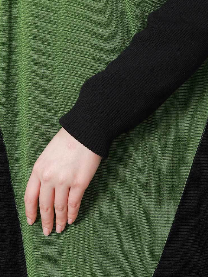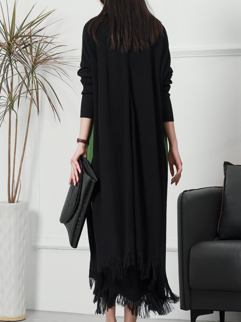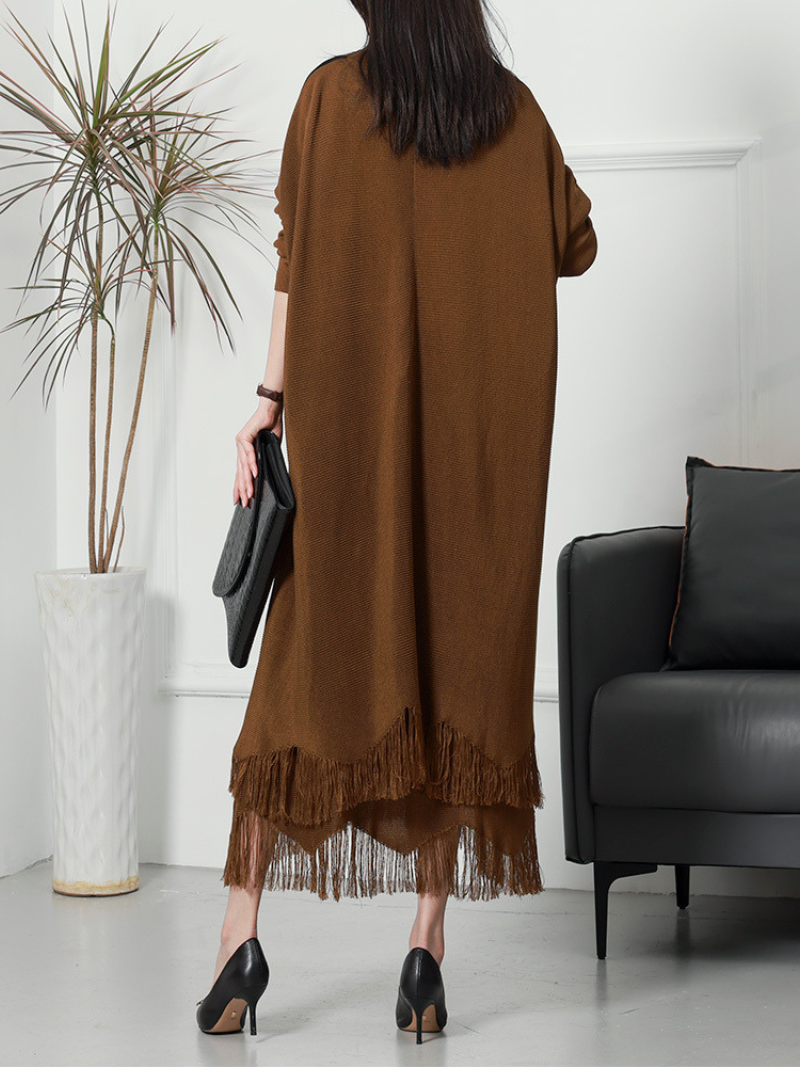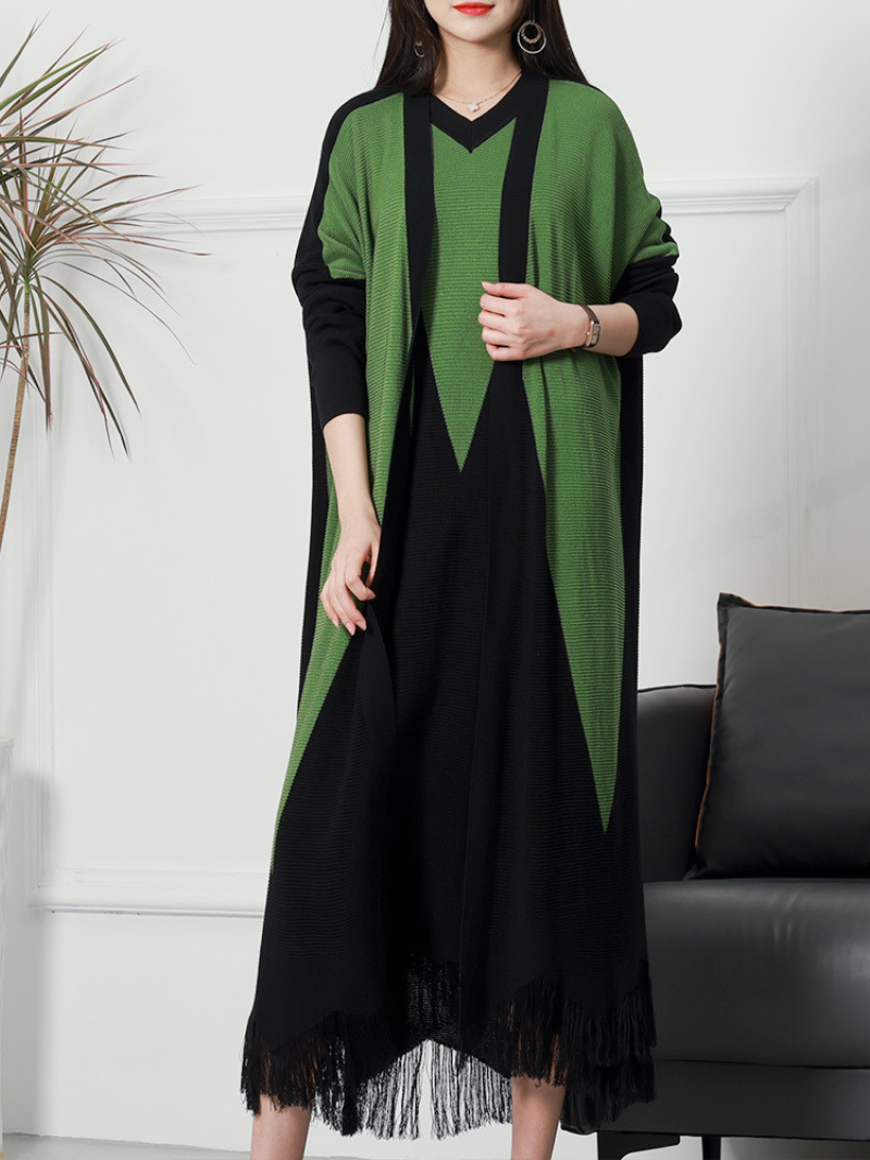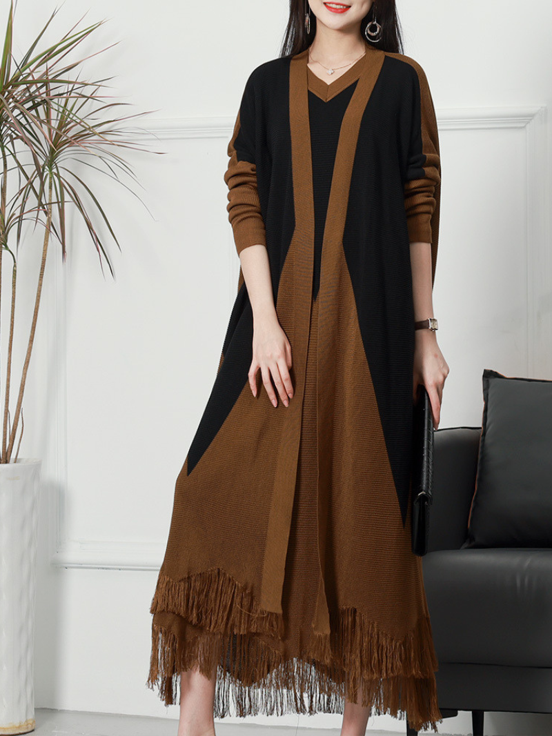 Pure Polyester V-neck Knitted Cardigan Long Sleeves Midi-Dress