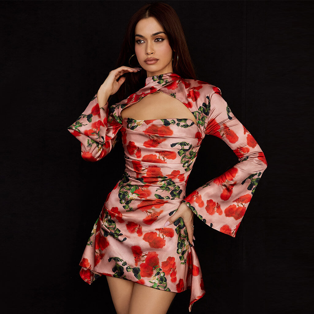 Rose CutOut High Neck Bell Sleeve Pleated Printed Mini Dress - Red