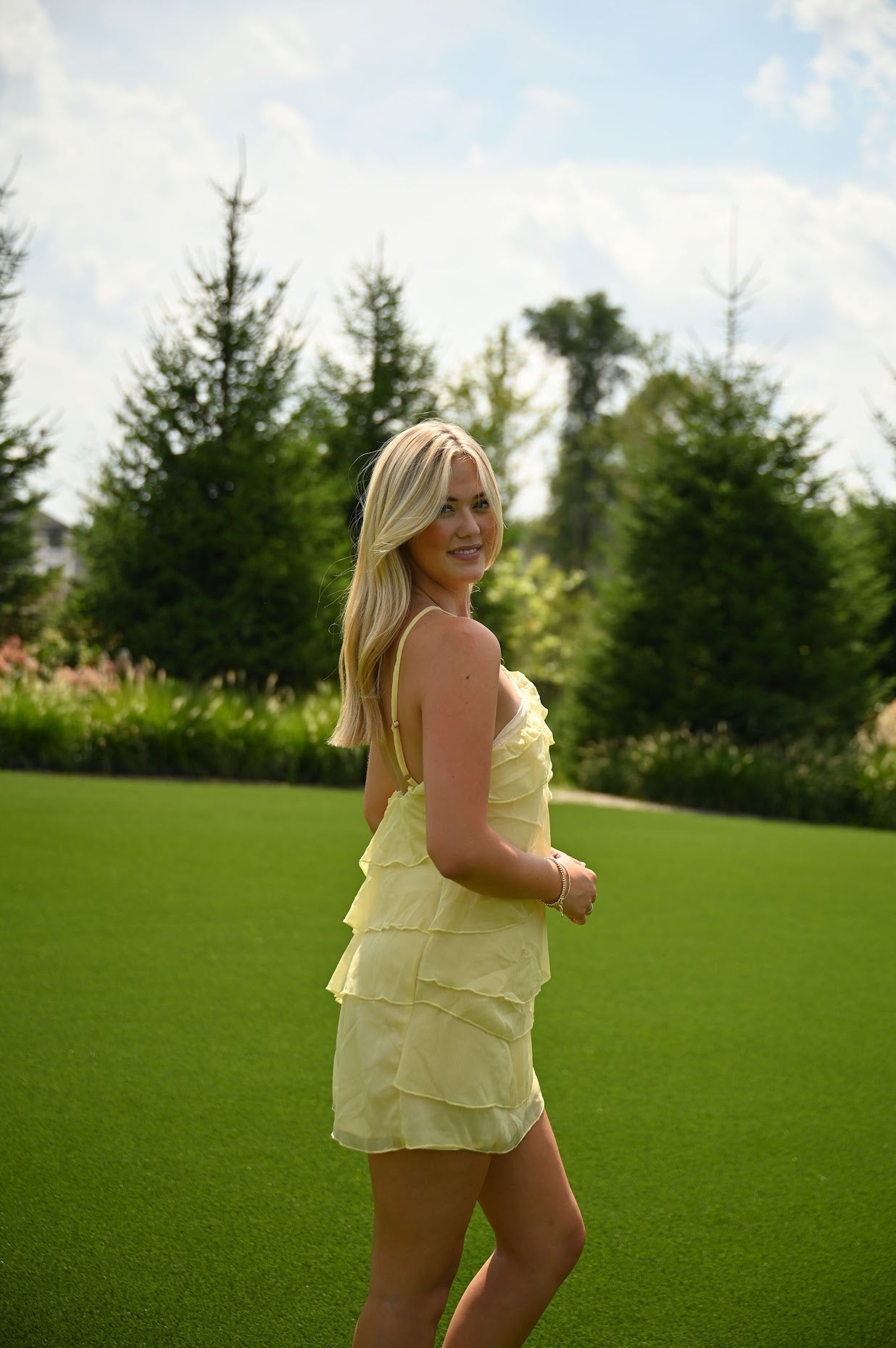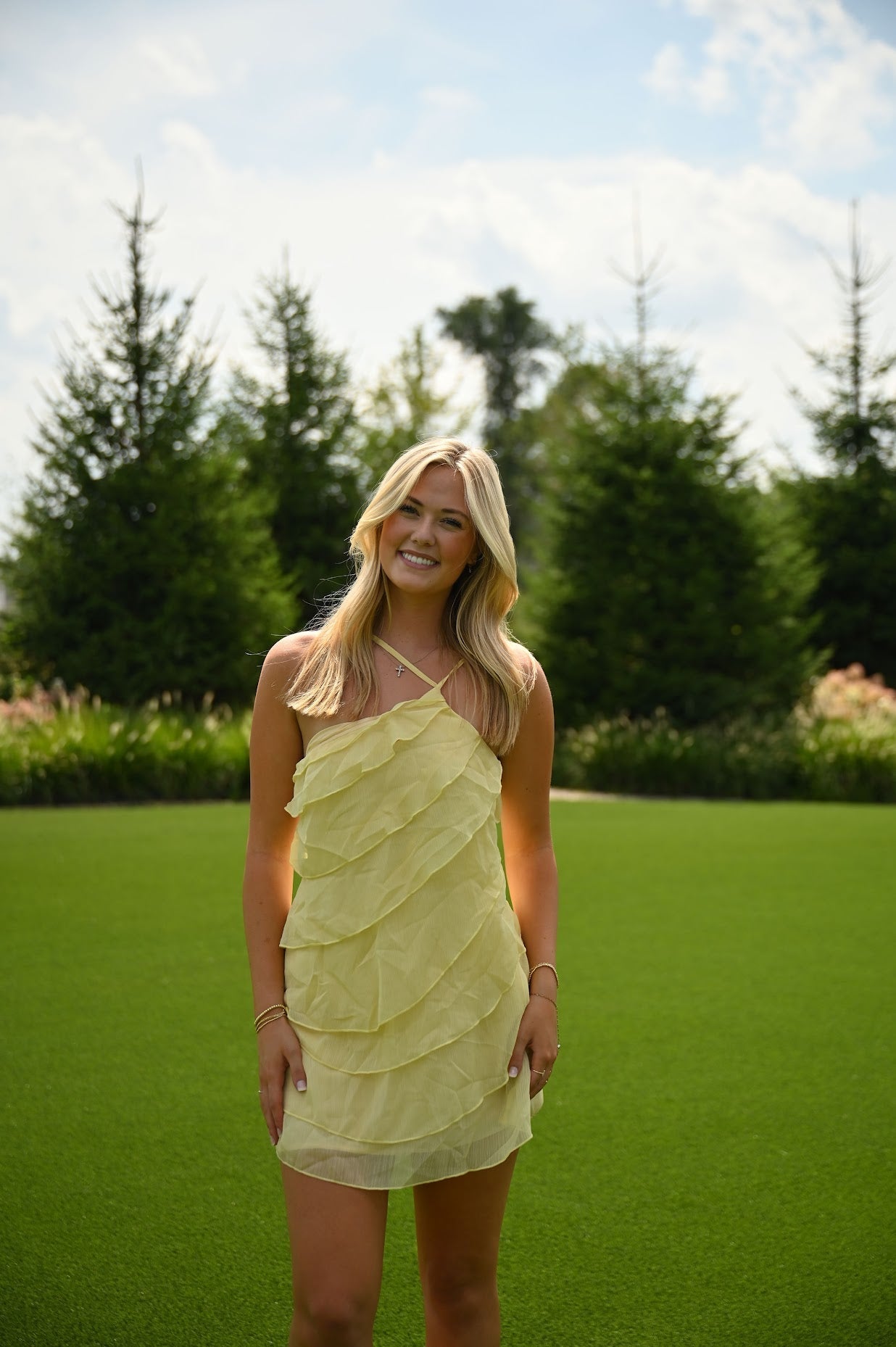 Step into charm with the Rose Dress in yellow, featuring playful ruffle details and a flirty mini length. Perfect for sunny days or fun nights out, this dress adds a touch of whimsy to your wardrobe while keeping you comfortable and stylish. Embrace your playful side with this sweet, feminine favorite.