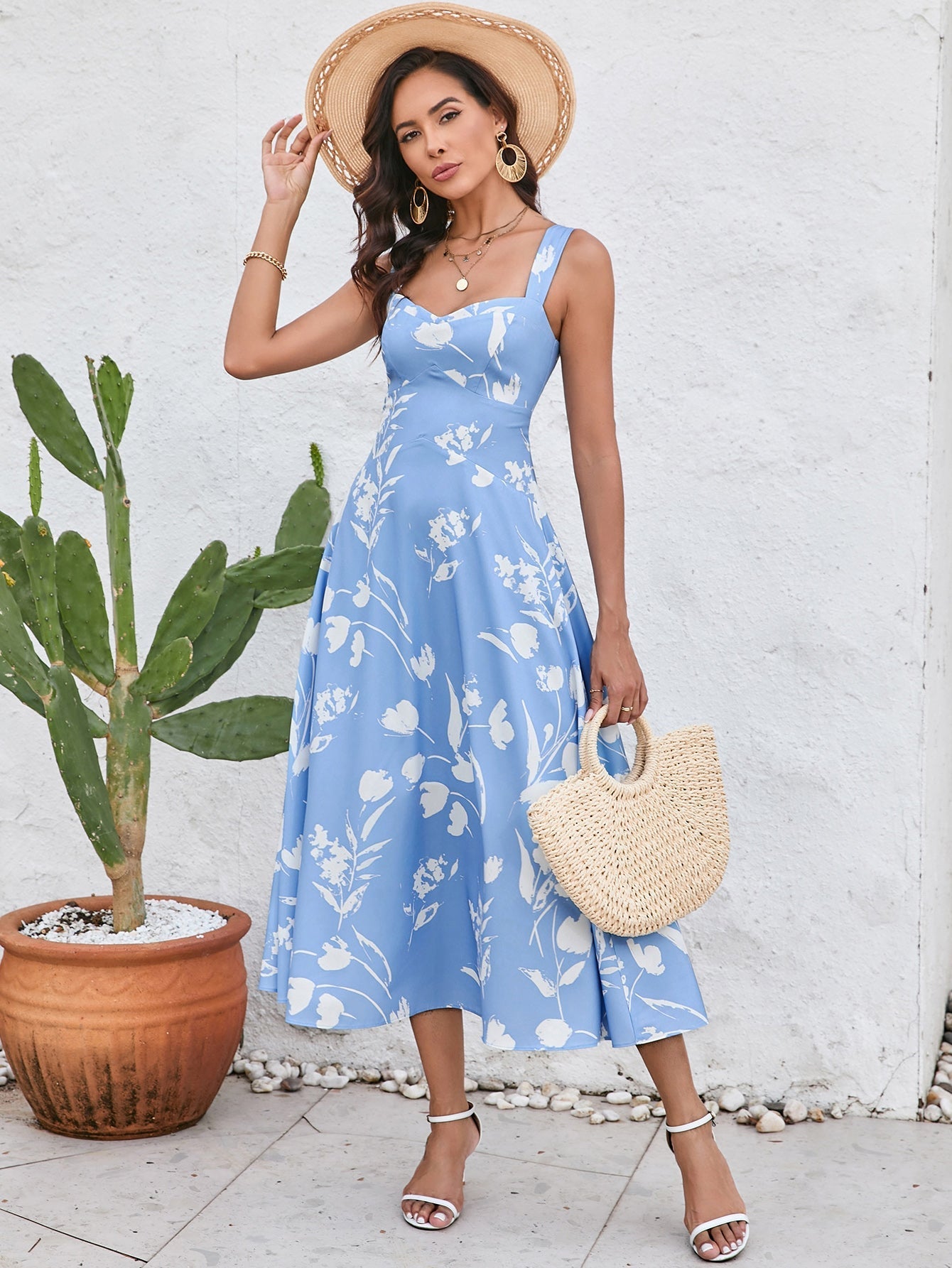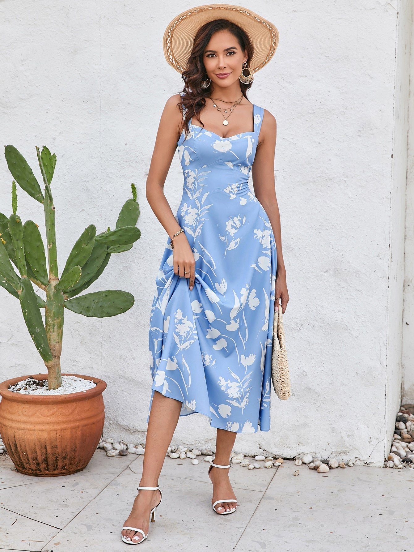 Ruched Backless Floral Print Midi Dress