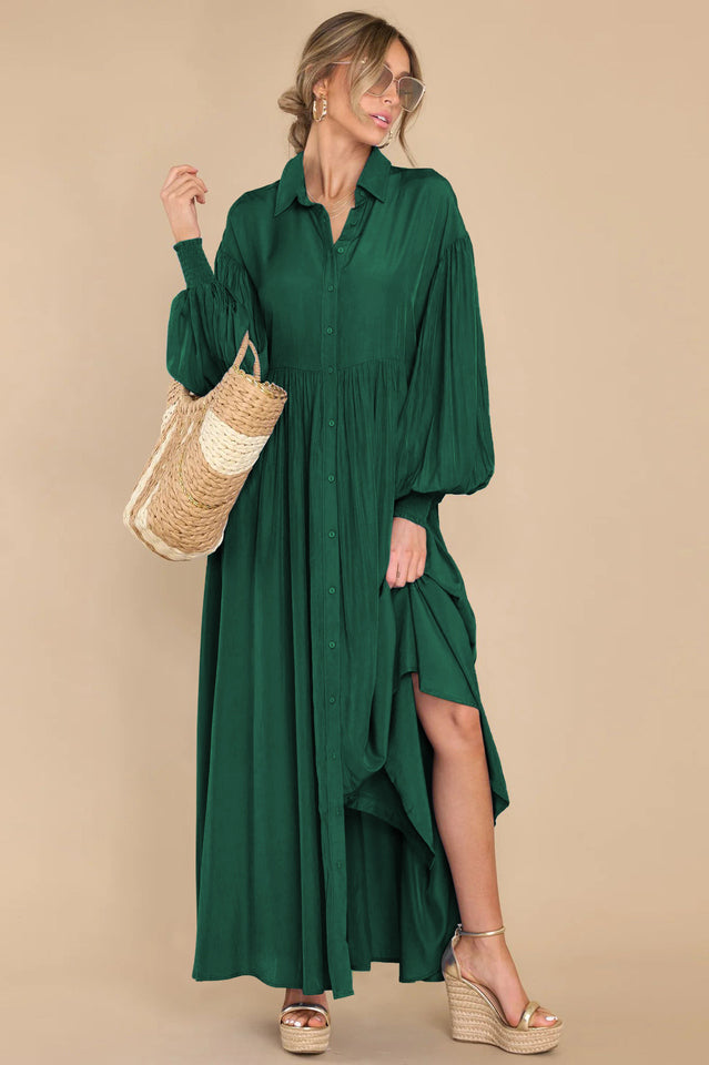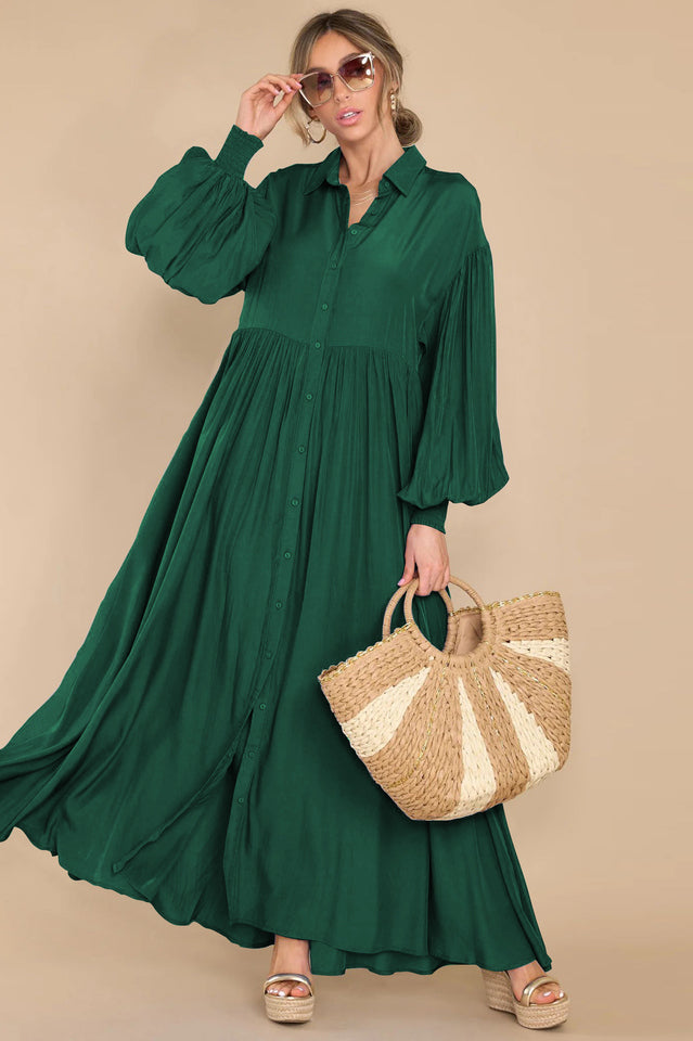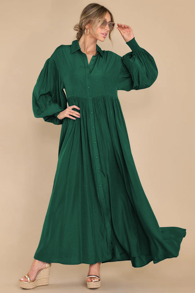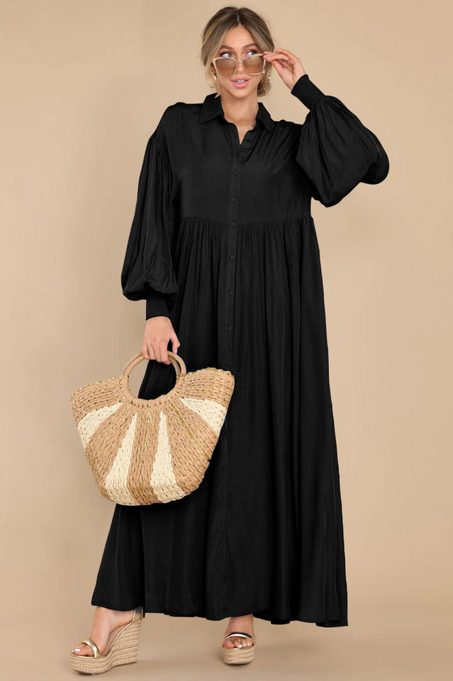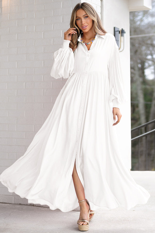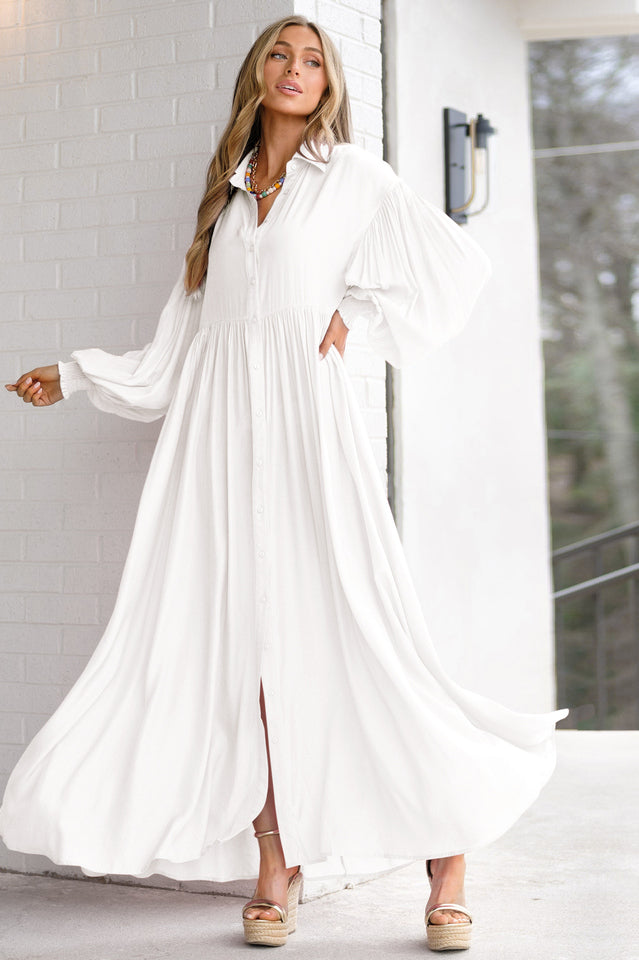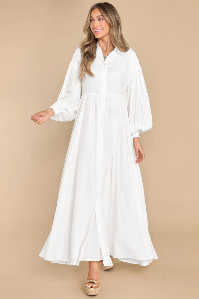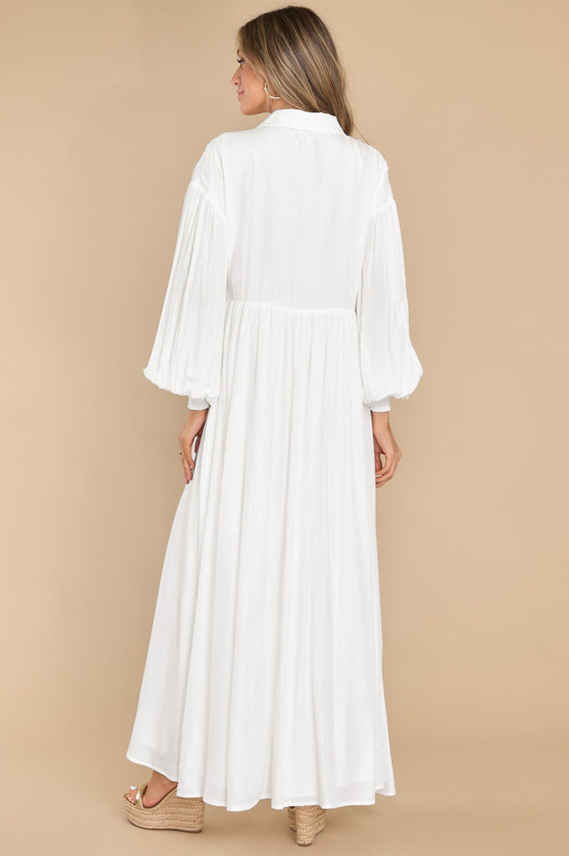 Take my advice and Run Towards Love in this sweet white maxi! Just like this flowy balloon sleeve dress, there is a perfect amount of room for you to enjoy every move of the journey! This maxi dress features a collared neckline, functional buttons down the bodice, balloon sleeves with elastic cuffs, and an oversized flowy fit.