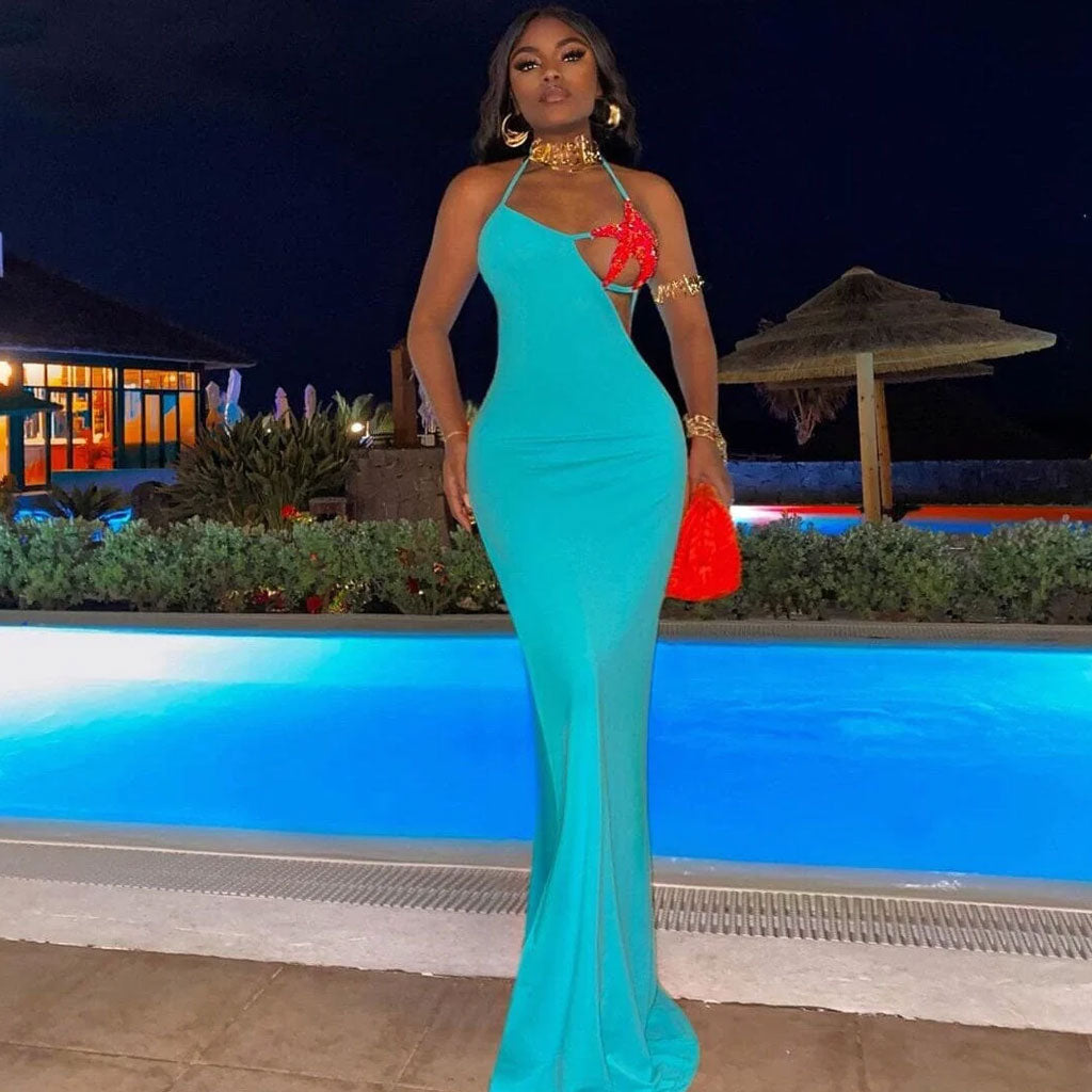 Sexy Bold Starfish Bra Halter Neck High Split Backless Maxi Evening Dress