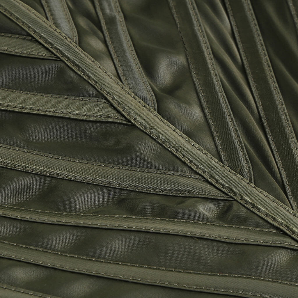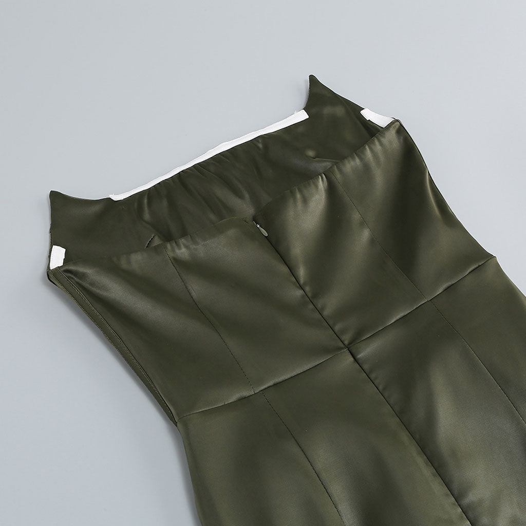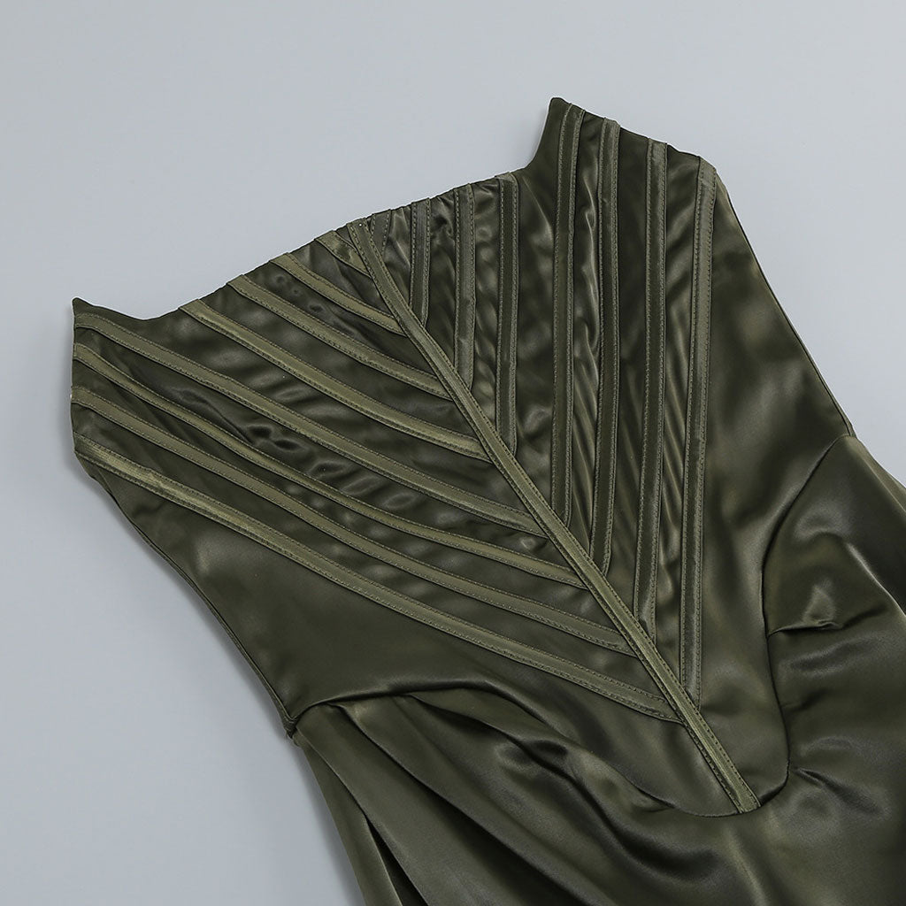 Wondering how to dress like a Diva Queen? Its daring corset-inspired bodice. with an edgy cat-ear neckline. enhances your curves and creates a flattering and feminine draped drop-waist silhouette. With its bandeau top design. this silky satin prom dress showcases your shoulders and neckline. creating a timeless and sophisticated look. Crafted from luxurious satin army green hue. this designer tube gown hits at just the right mid-length to showcase your curves and define your figure. The thigh high split adds a touch of sensuality and movement. allowing you to dance and walk with grace and confidence.