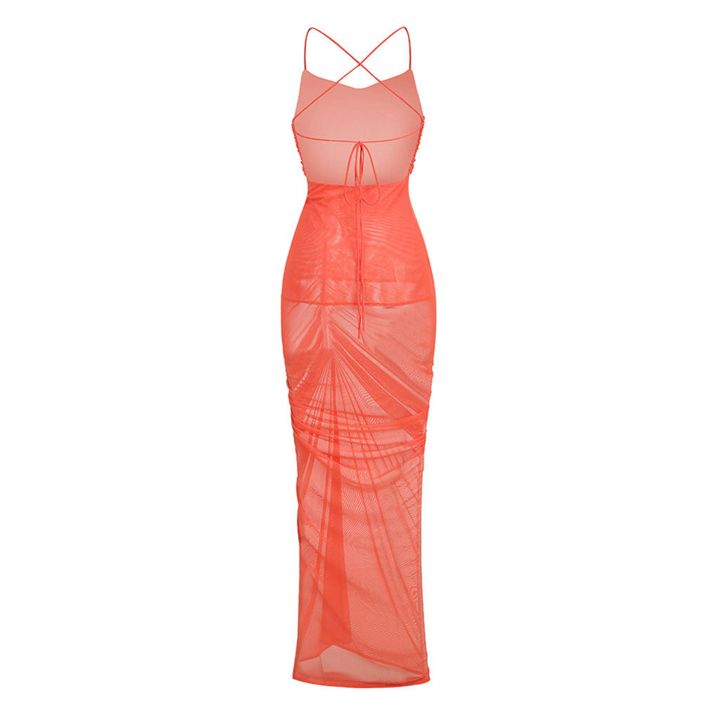 Sexy Crisscross Backless Semi Sheer Mesh Ruched Thigh Split Maxi Evening Dress