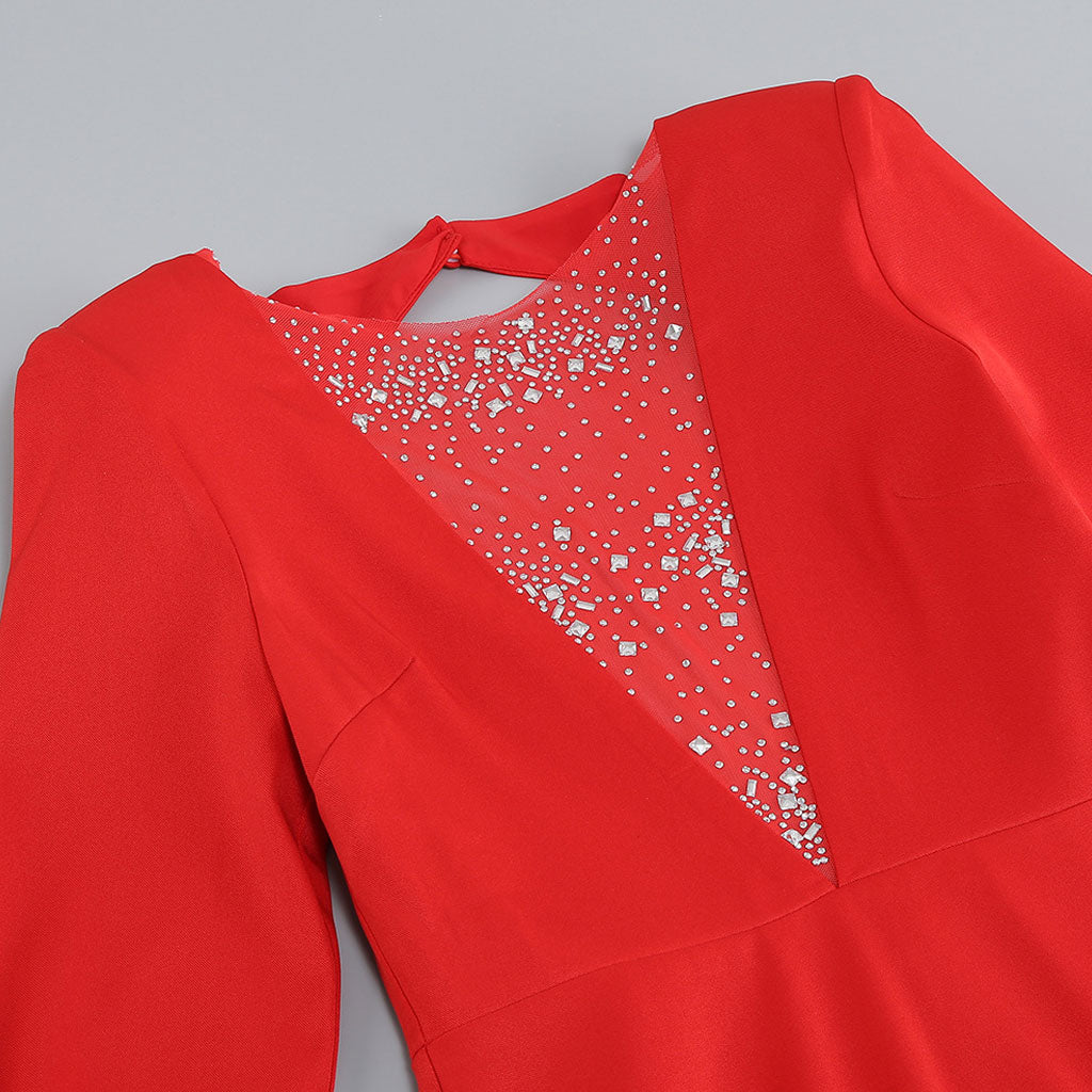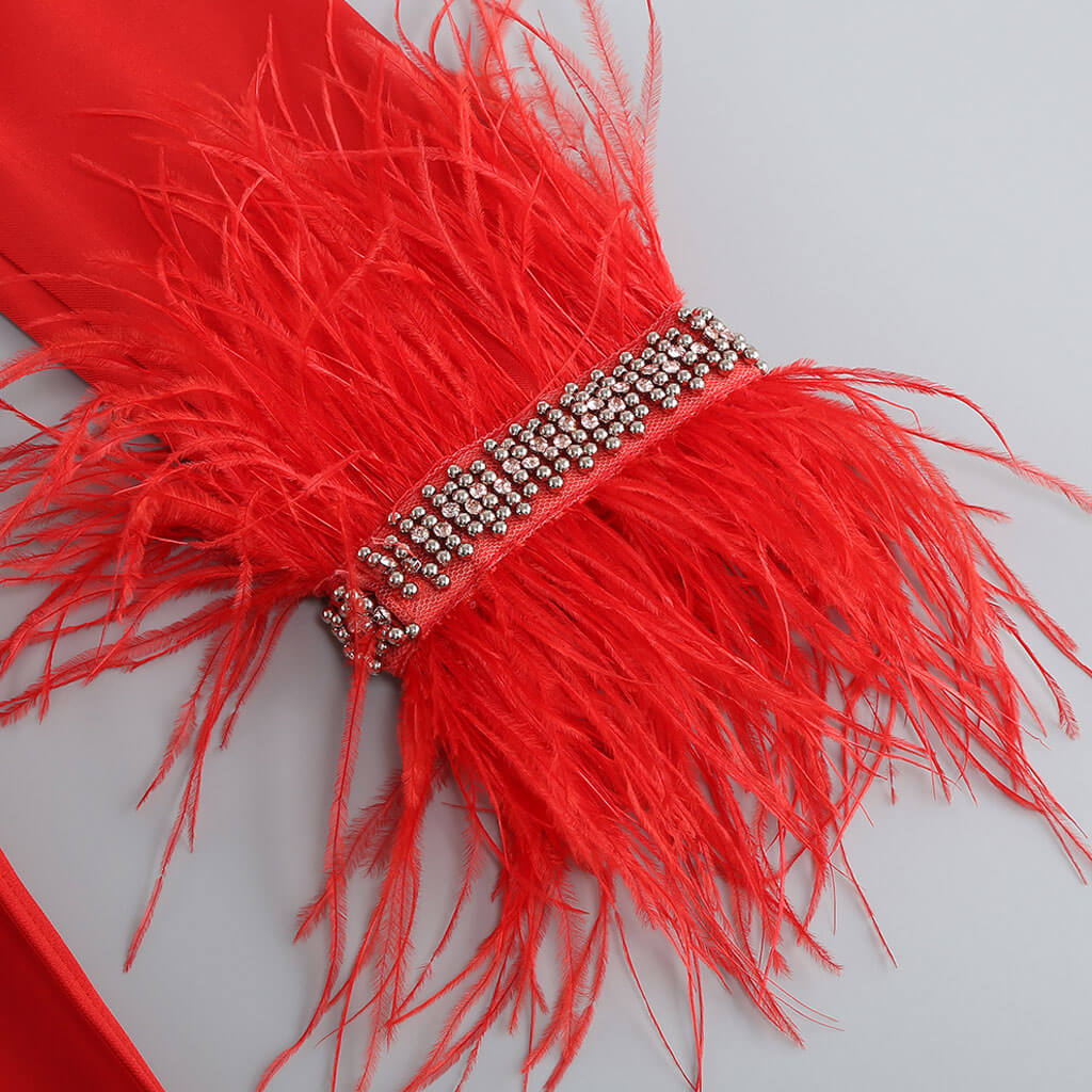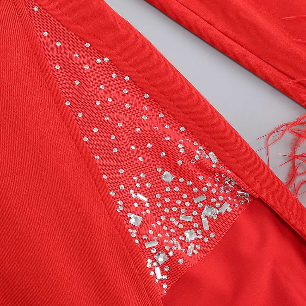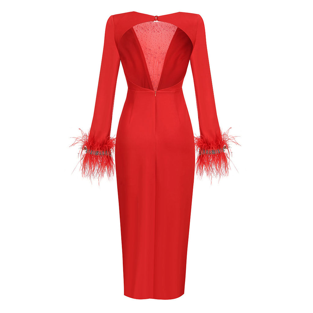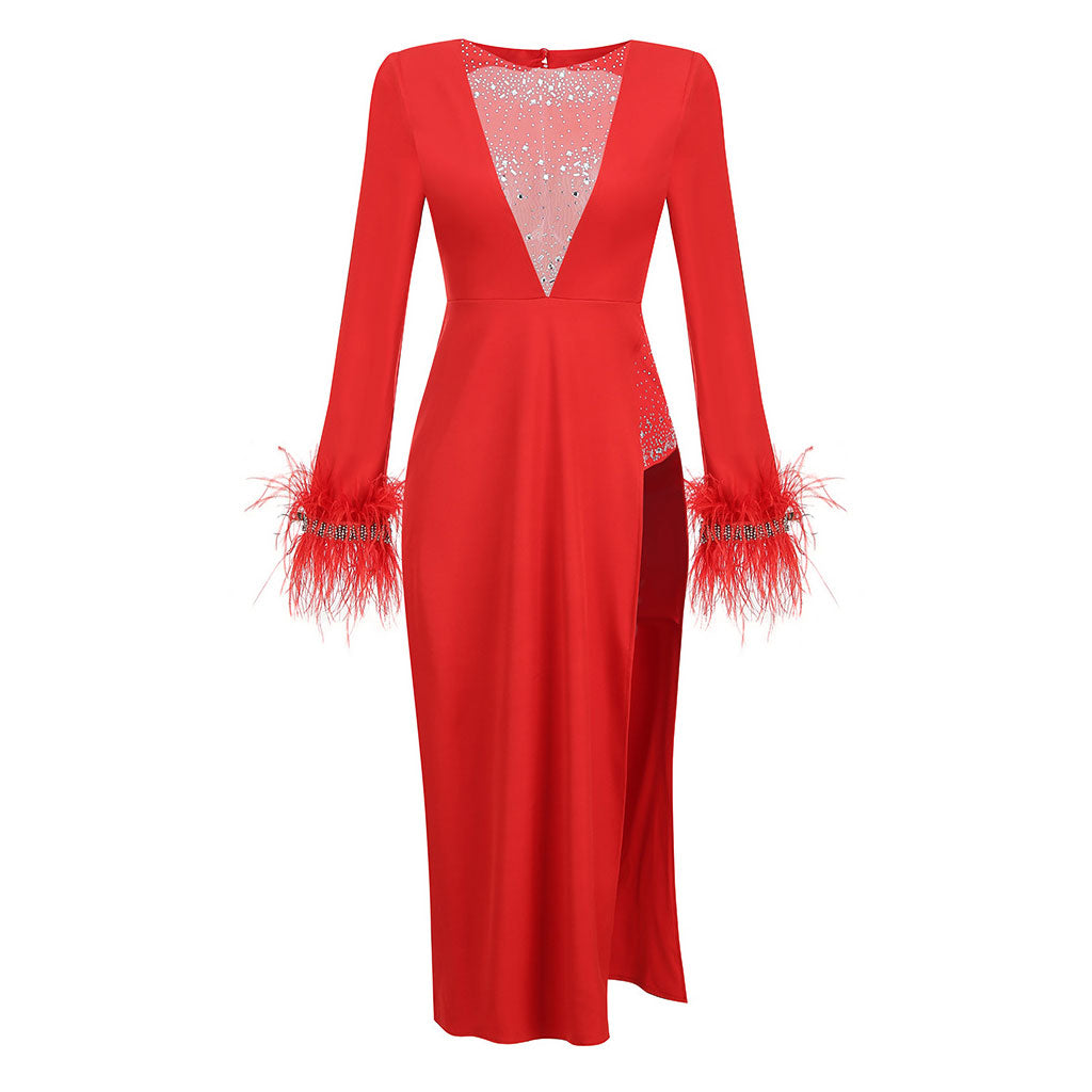 Sexy Faux Feather Long Sleeve Open Back Crystal Deep V Slit Maxi Dress