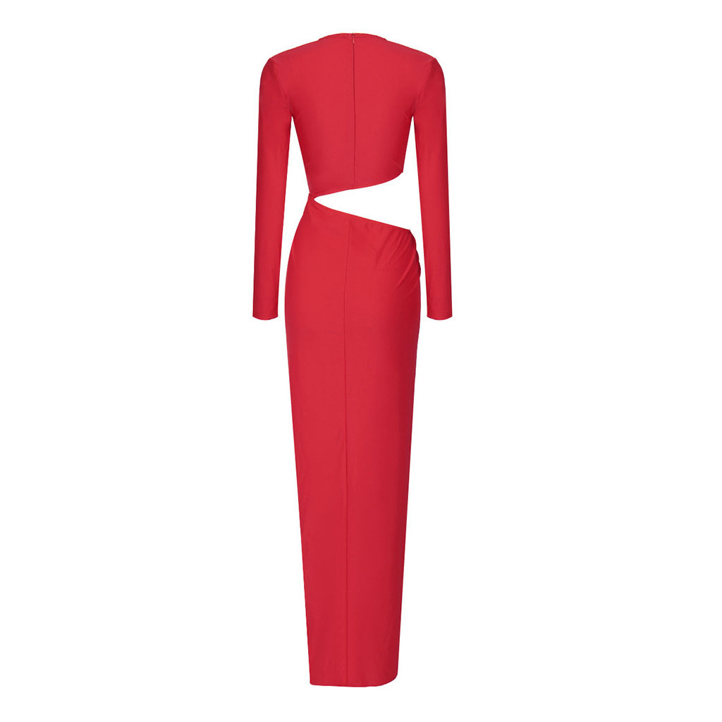 Sexy Plunge Neck Long Sleeve CutOut Ruched O Ring Draped High Low Evening Dress