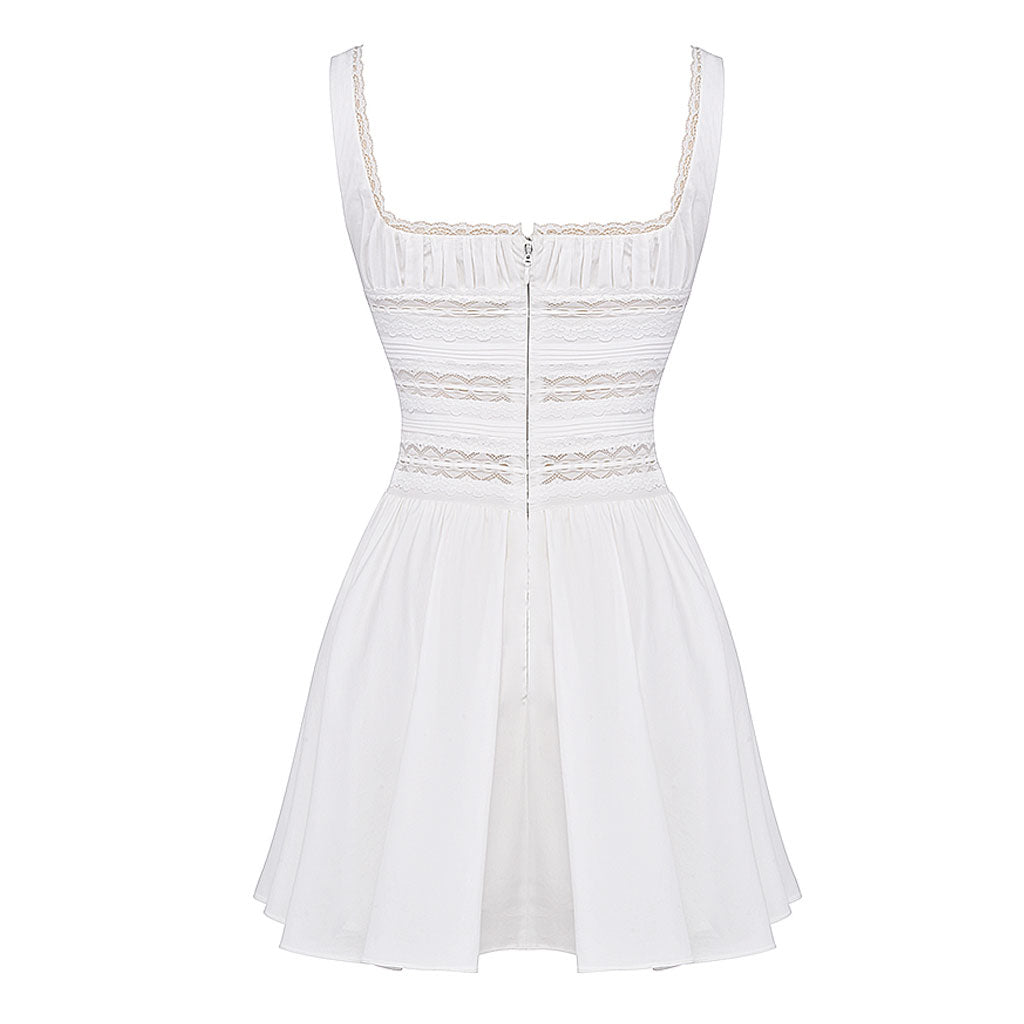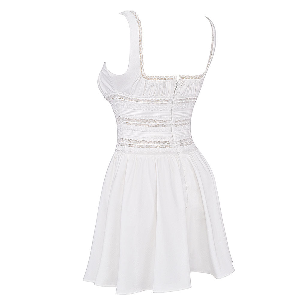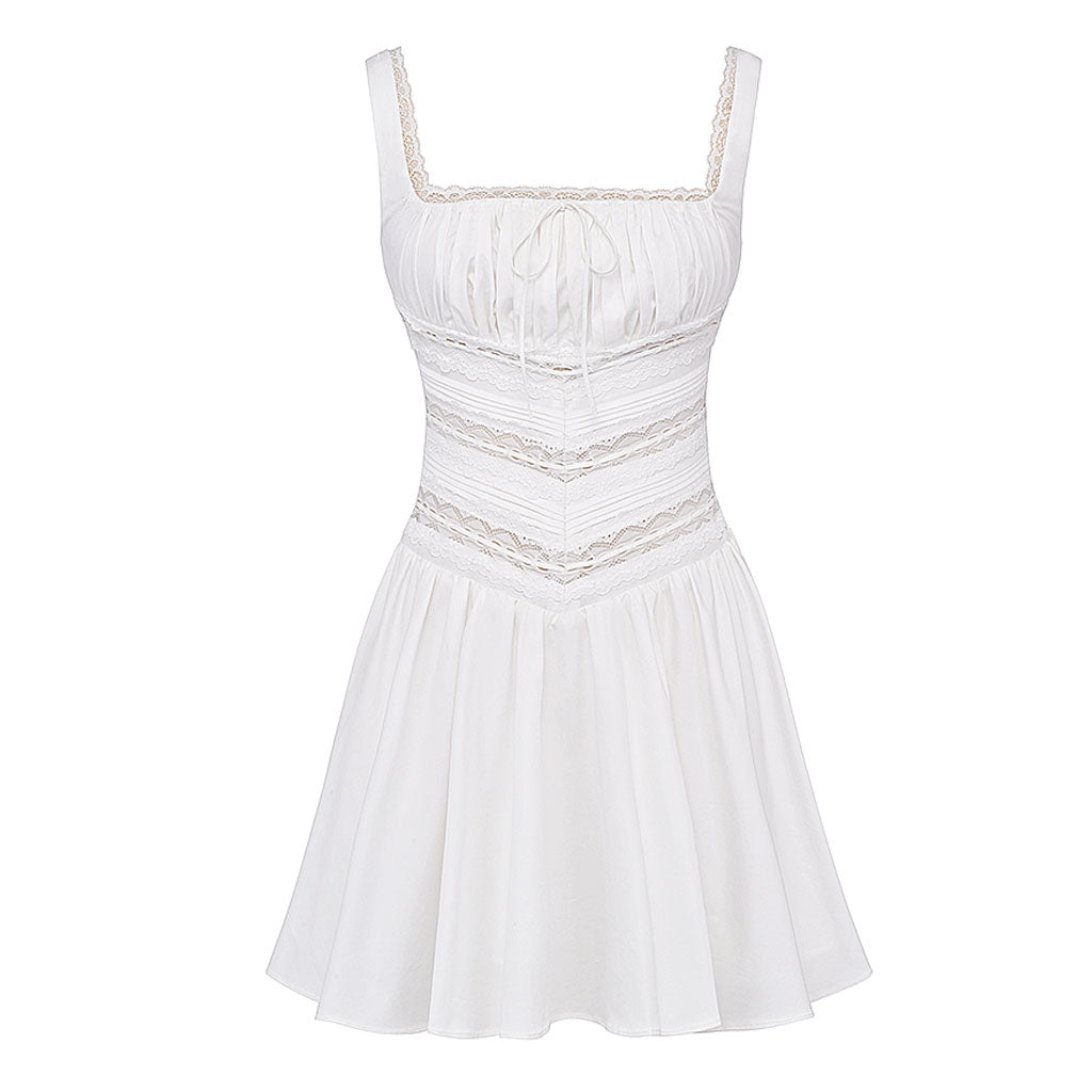 Sexy Ruched Tie Front Square Neck Suspender Strap Lace Trim Mini SunDress