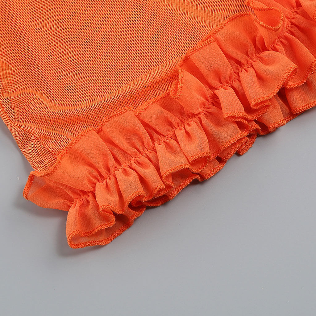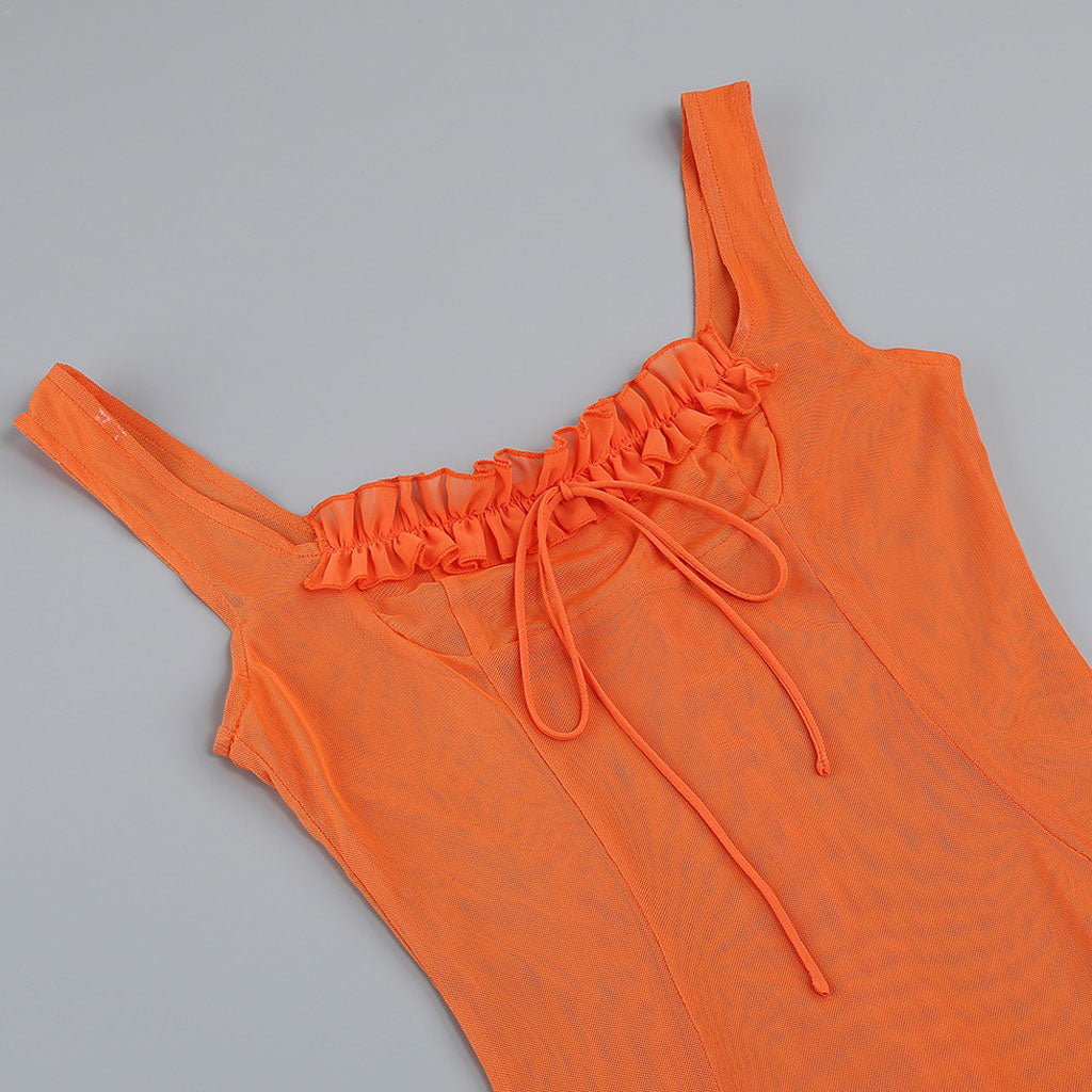 Sexy Ruffle Trim Square Neck Sleeveless Thigh Split Sheer Mesh Maxi Dress