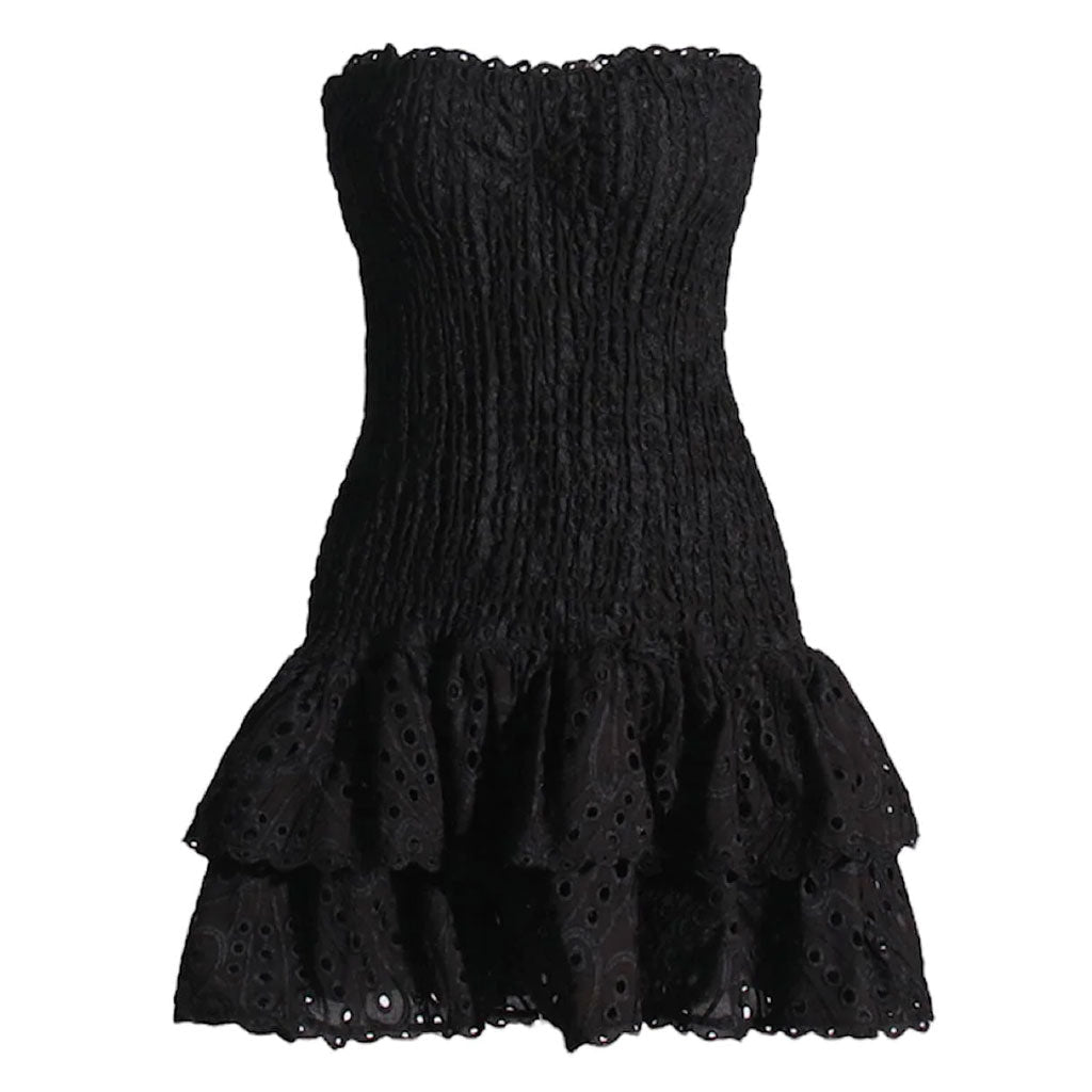 Sexy Scalloped Strapless Smocked Broderie Anglaise Tiered Ruffled Mini Dress