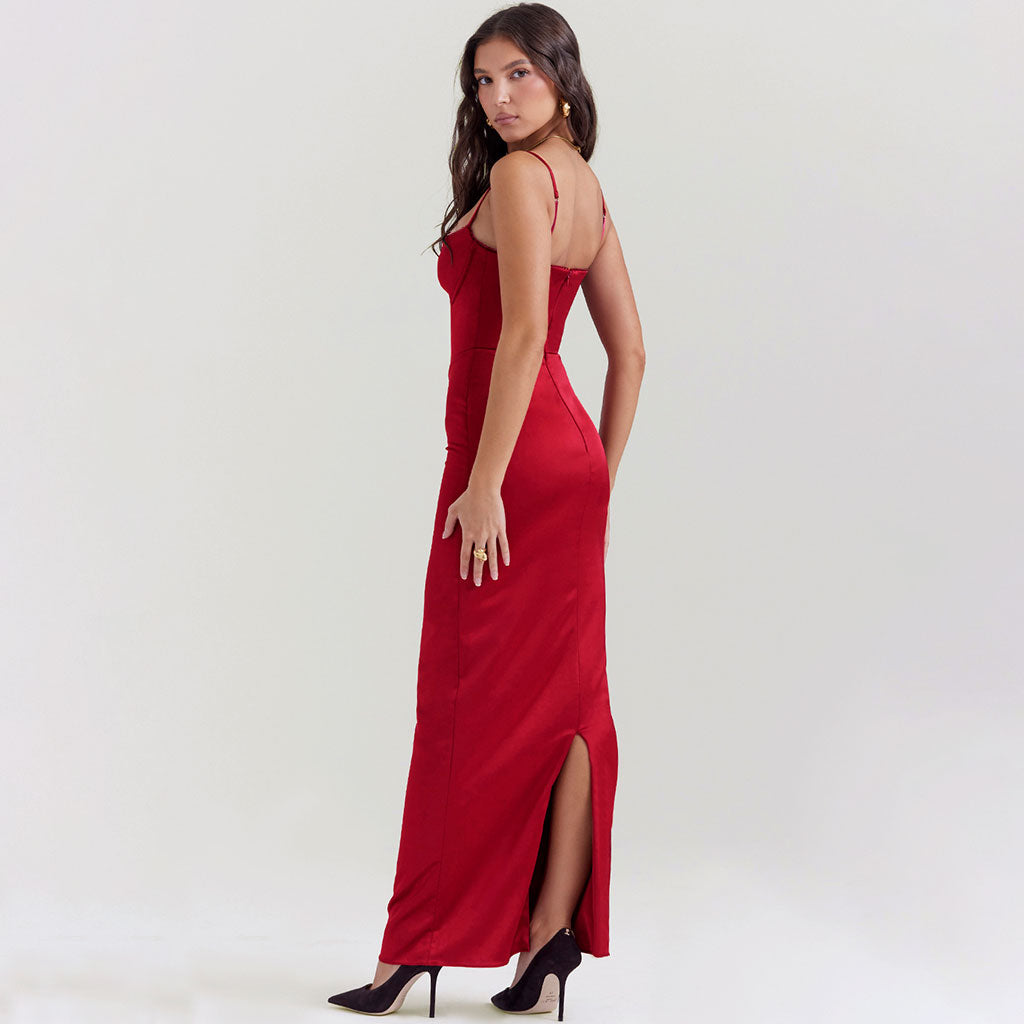 This opulent satin maxi dress boasts a scalloped trim sweetheart neckline. adjustable spaghetti shoulder straps. and a back slit destined for absolute slayage! It guarantees a figure-hugging fit in a festive red hue. ideal for Holidays and Festivals! Its sleeveless silhouette with a corset bodice ensures a snug embrace of your curves. just as you desire. Look no further - this glamorous designer maxi gown is precisely what you need to elevate your style. Glam up and make a lasting statement with this stunning maxi slip.