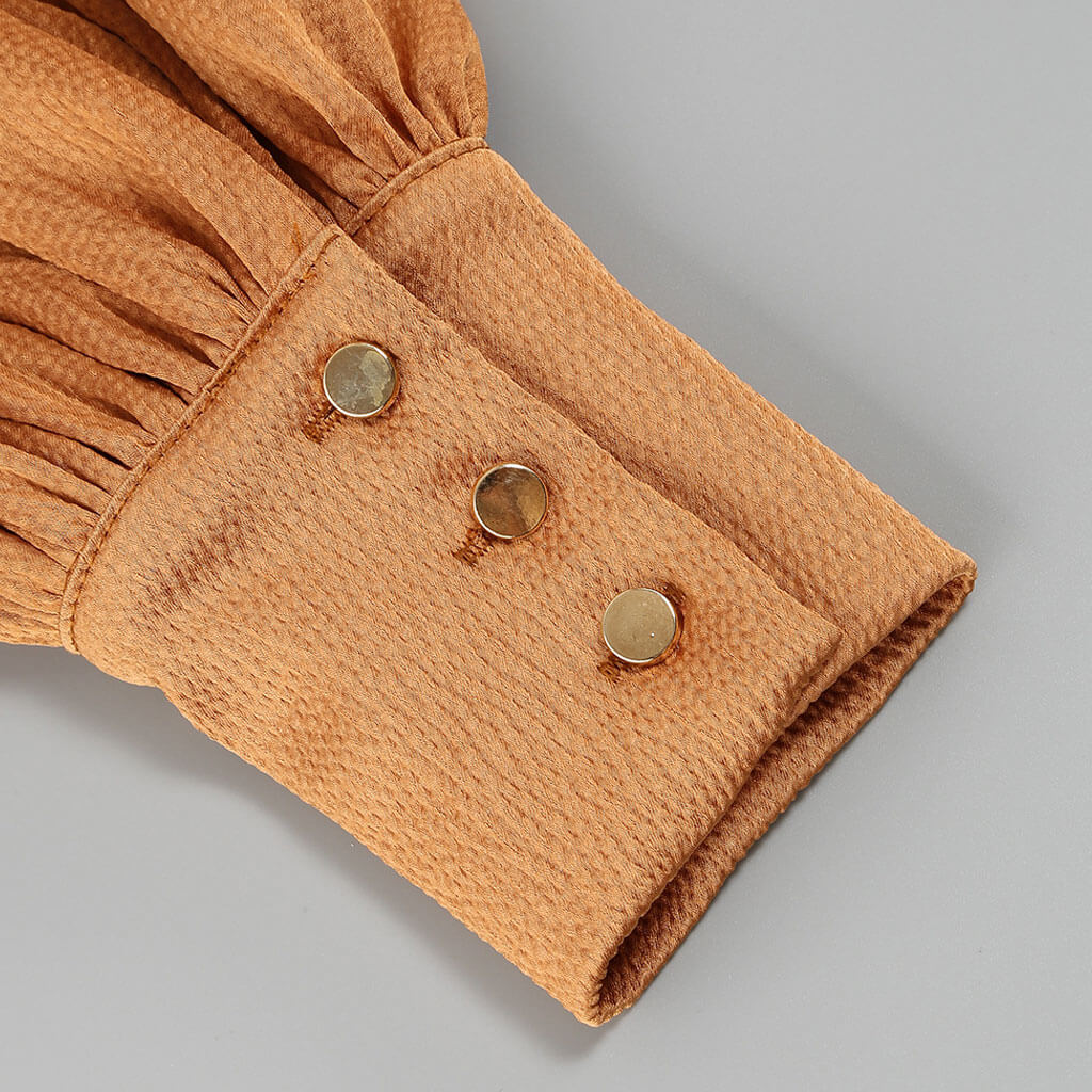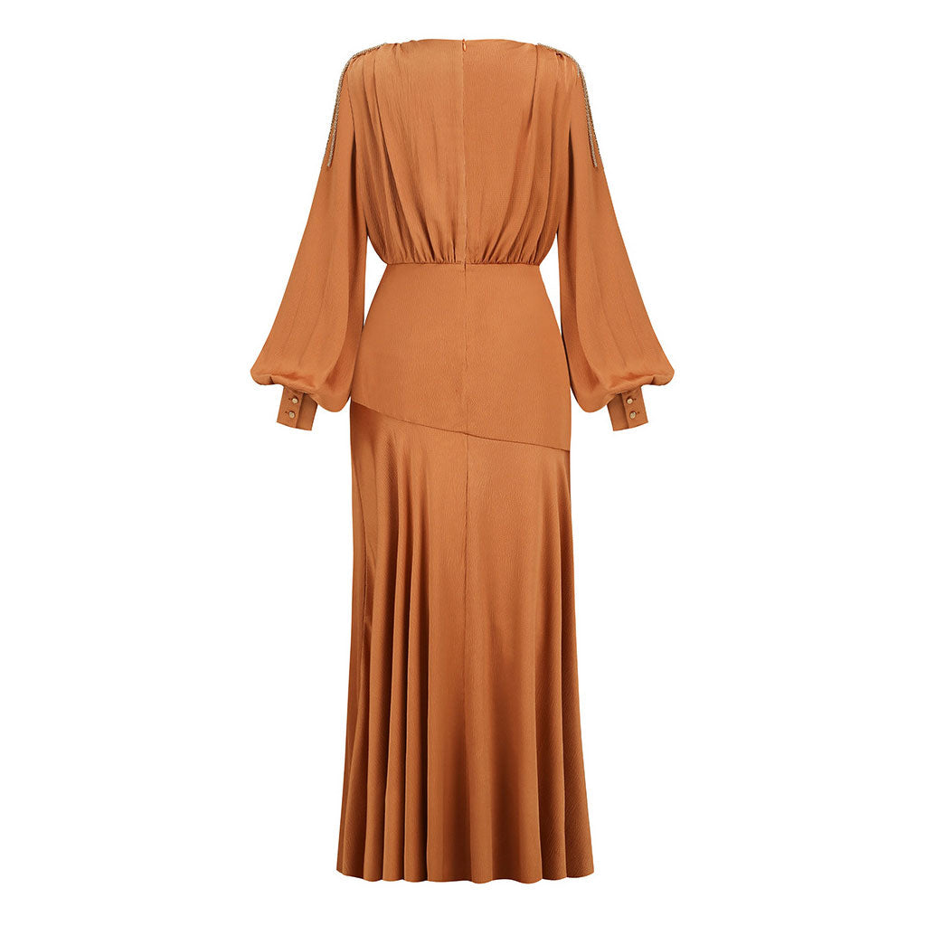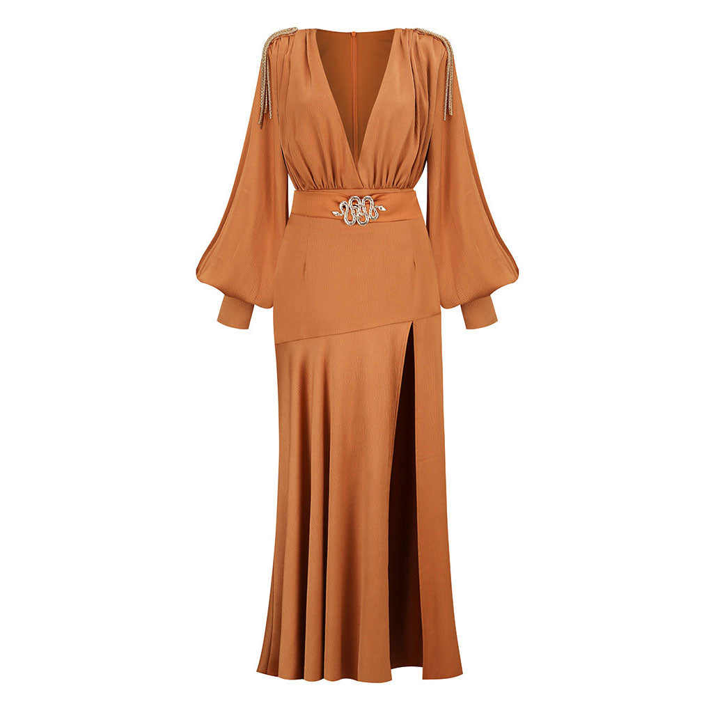 This extraordinary designer prom dress features a daring deep V neckline that adds a touch of allure. complemented by the statement bishop sleeves that create an elegant and dramatic look. The unique snake accent detachable belt and tassel shoulder epaulet detail add a bold and edgy twist to the ensemble. making it a true fashion statement. The side split adds a touch of sensuality and movement. while the floor length ensures a grand and captivating presence. Crafted with meticulous attention to detail. this evening maxi gown guarantees a polished and refined finish. perfect for those special occasions where you want to leave a lasting impression. A gold-tone high heel is enough!