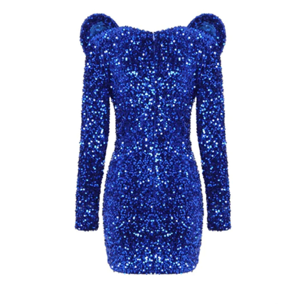 Sparkly Collar Deep Plunging Neck Long Sleeve Sequin Mini Dress - Royal Blue