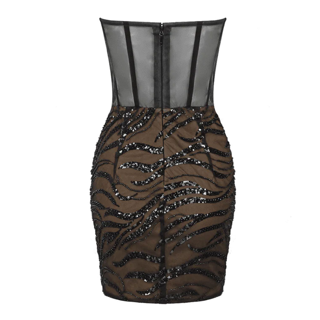Sparkly Crystal and Sequin Sheer Mesh Corset Ruched Strapless Mini Party Dress