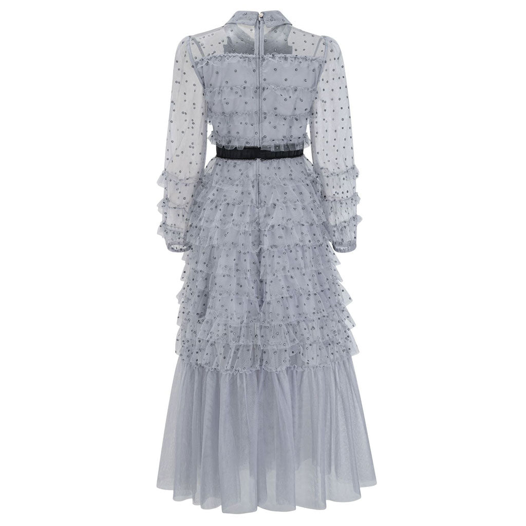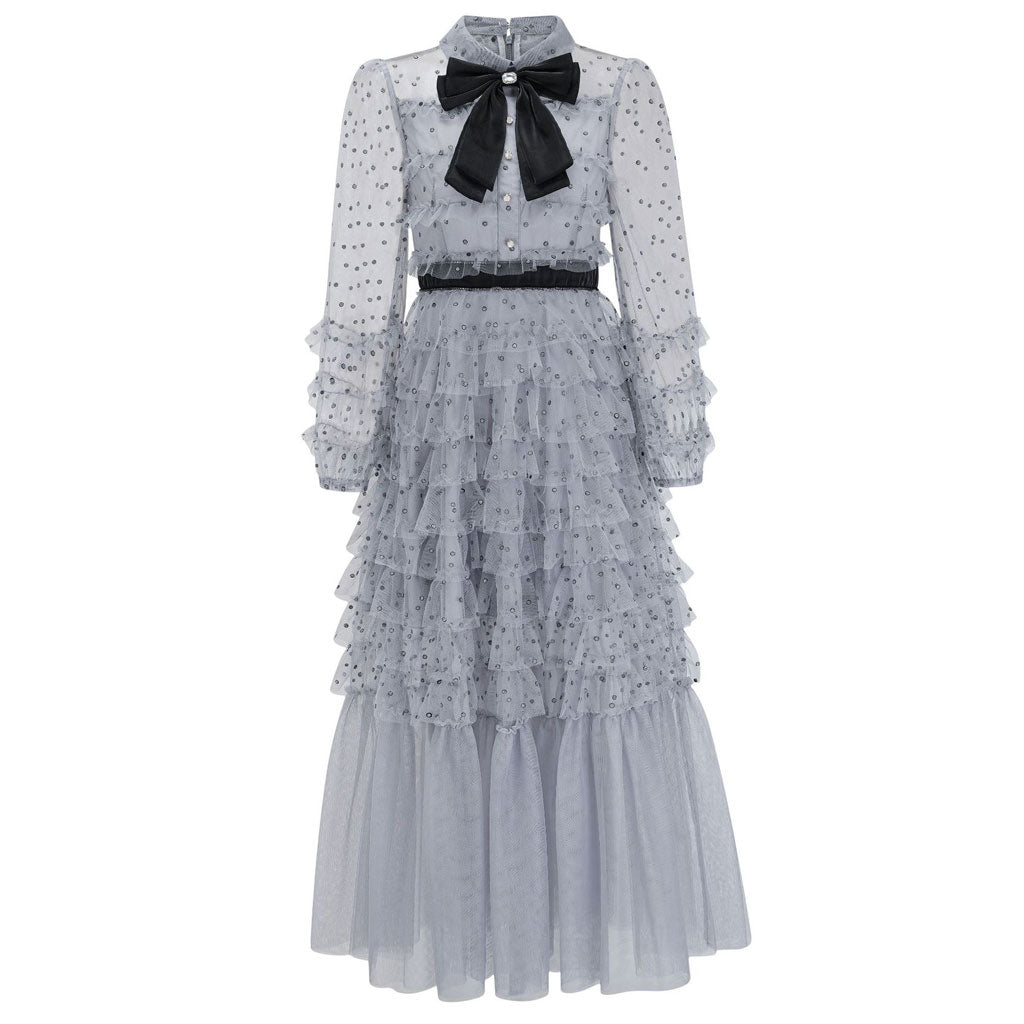 Sparkly Crystal Bow Collared Bishop Sleeve Dotted Tulle Ruffle Tiered Maxi Dress