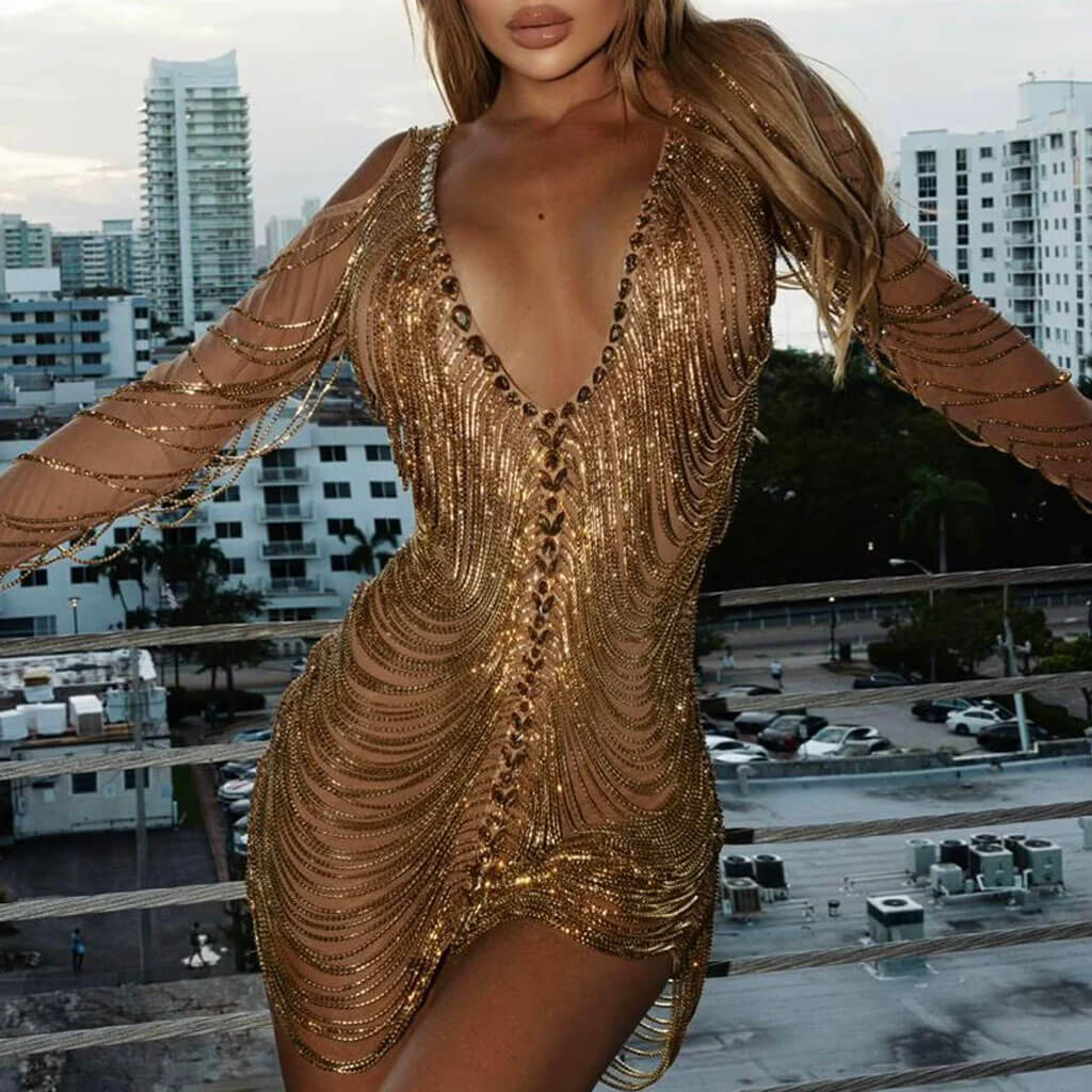 Designed to offer a truly luxurious experience. our Sparkly Rhinestone Chain Dress is a masterpiece in itself. Immerse yourself in the essence of luxury as you slip into this enchanting short prom dress. It features a deep V neckline and a captivating V-back. adorned with crystal stones along the edges. The cut-out design on the shoulders transitions gracefully into long sleeves and semi-sheer mesh fabric. flawlessly blending designer aesthetics with contemporary trends. Adorned with a shimmering fringe chain. this glittering thigh-grazing dress epitomizes opulence. The concealed rear zip ensures a seamless fit. adding to the surprise and allure of this exquisite addition to your collection of luxury attire.
