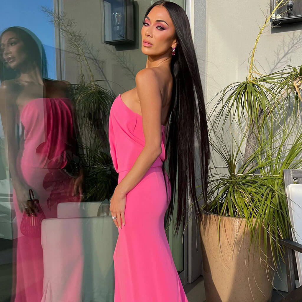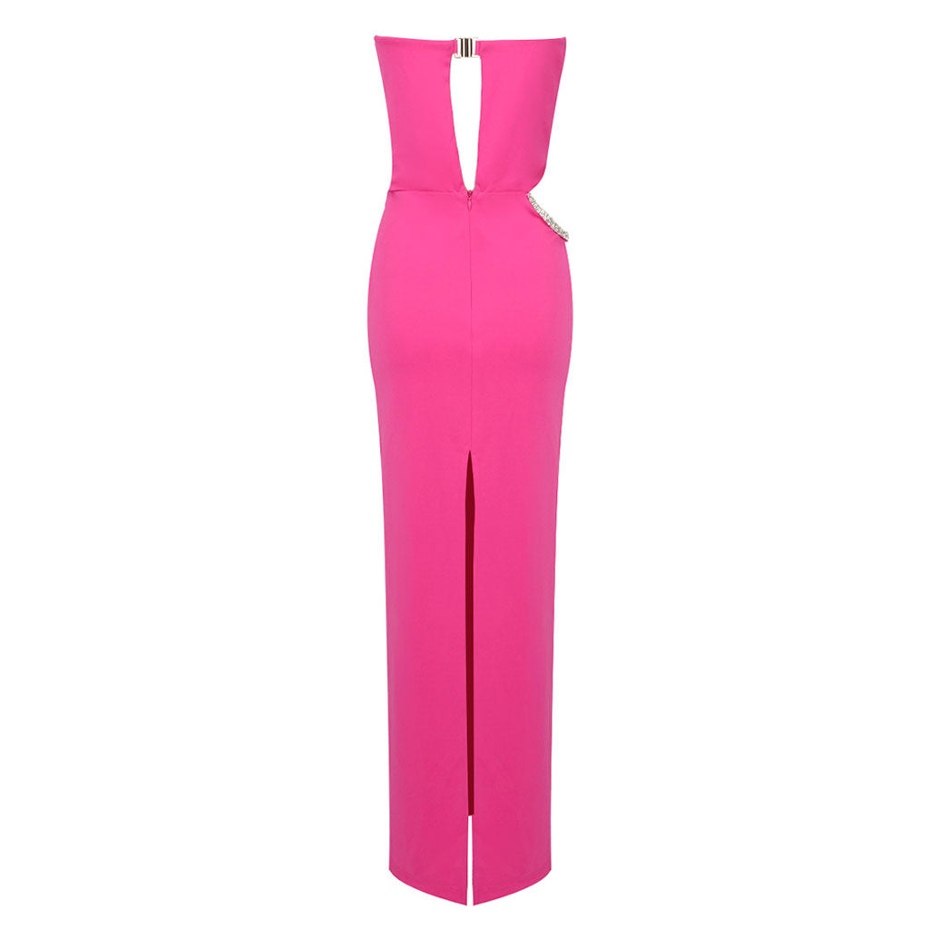 This hot pink gown dress is the ideal pick for a Barbie-themed night party. With its sparkling crystal cutout at the waist and exquisite pleated top design. it exudes charm. The bandeau neckline highlights your alluring shoulders. while the back split adds a hint of sensuality. This maxi tube dress accentuates your graceful figure. making you the radiant center of attention. Its discreet rear zipper and keyhole with clasp closure ensure both style and ease. Pair it with silver high heels and delicate jewelry. and you'll truly shine. embodying the joyous spirit of the night.