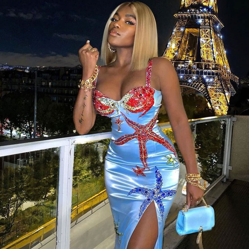 Vocational & sparkling rhinestones at front. this silky satin midi dress can be worn in different occasions whether it is a birthday. anniversary. party or others in summer. This tropical style embellished dress features a sweetheart neckline along with adjustable suspender shoulder s traps. a bodycon shape with a concealed back zip and an alluring front slit. and a tea length hemline. Complete your look with dazzling earrings and butterfly high heels. Our designer clothes collection offers plenty of luxury cocktail party dresses for women.