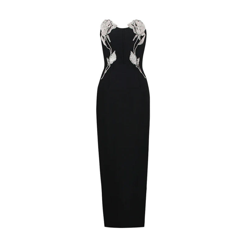 Sparkly Crystal Rose Embellished Side Slit Bodycon Maxi Dress - Black