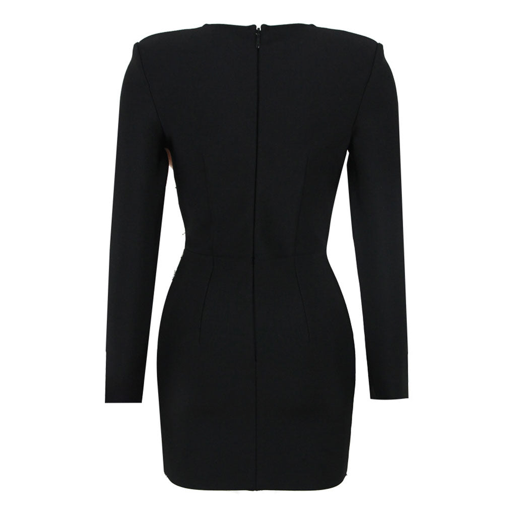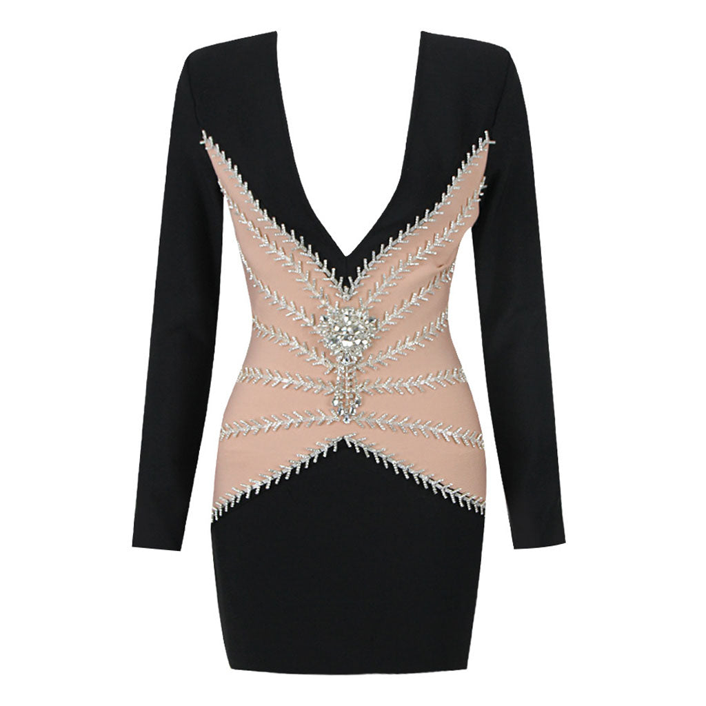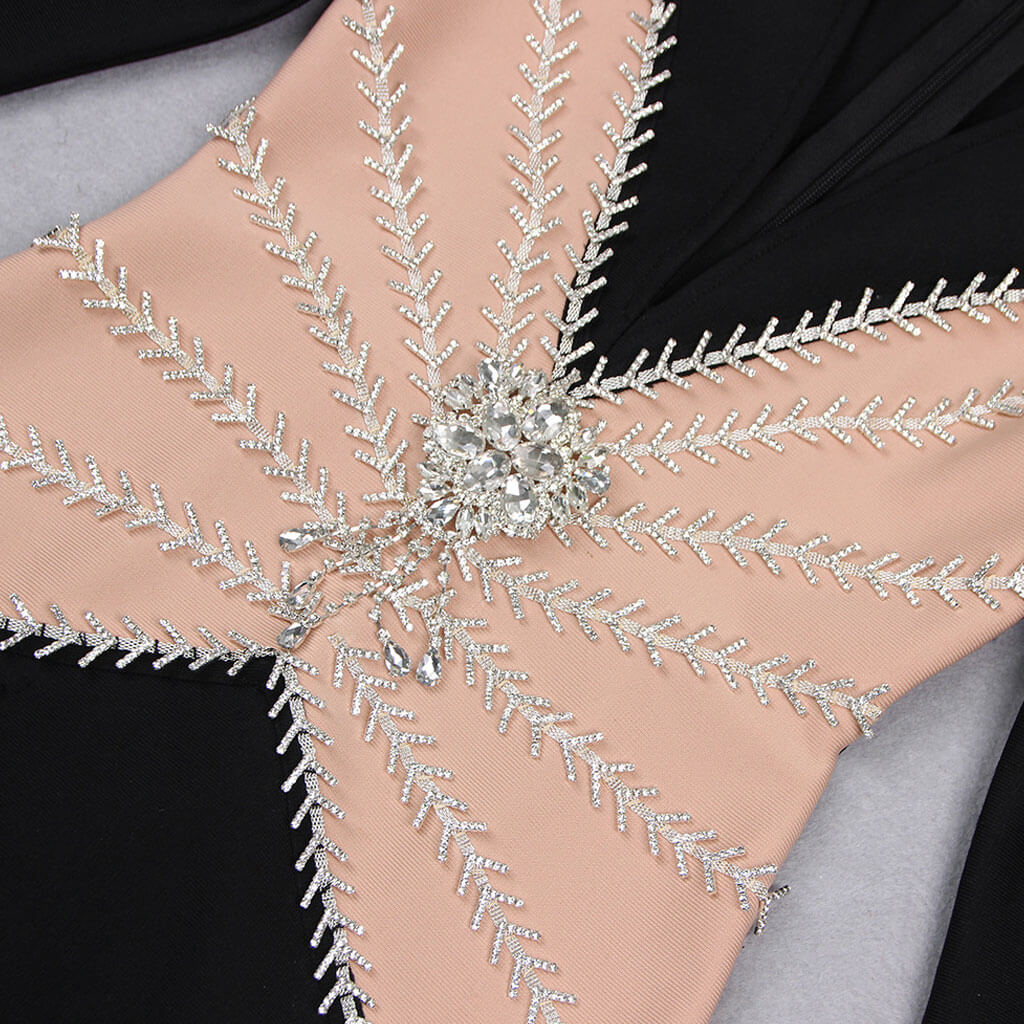 Sparkly Crystal Rosette Applique Bicolor Plunge Neck Bodycon Party Mini Bandage Dress