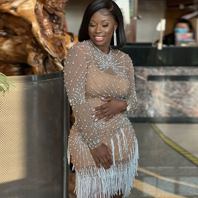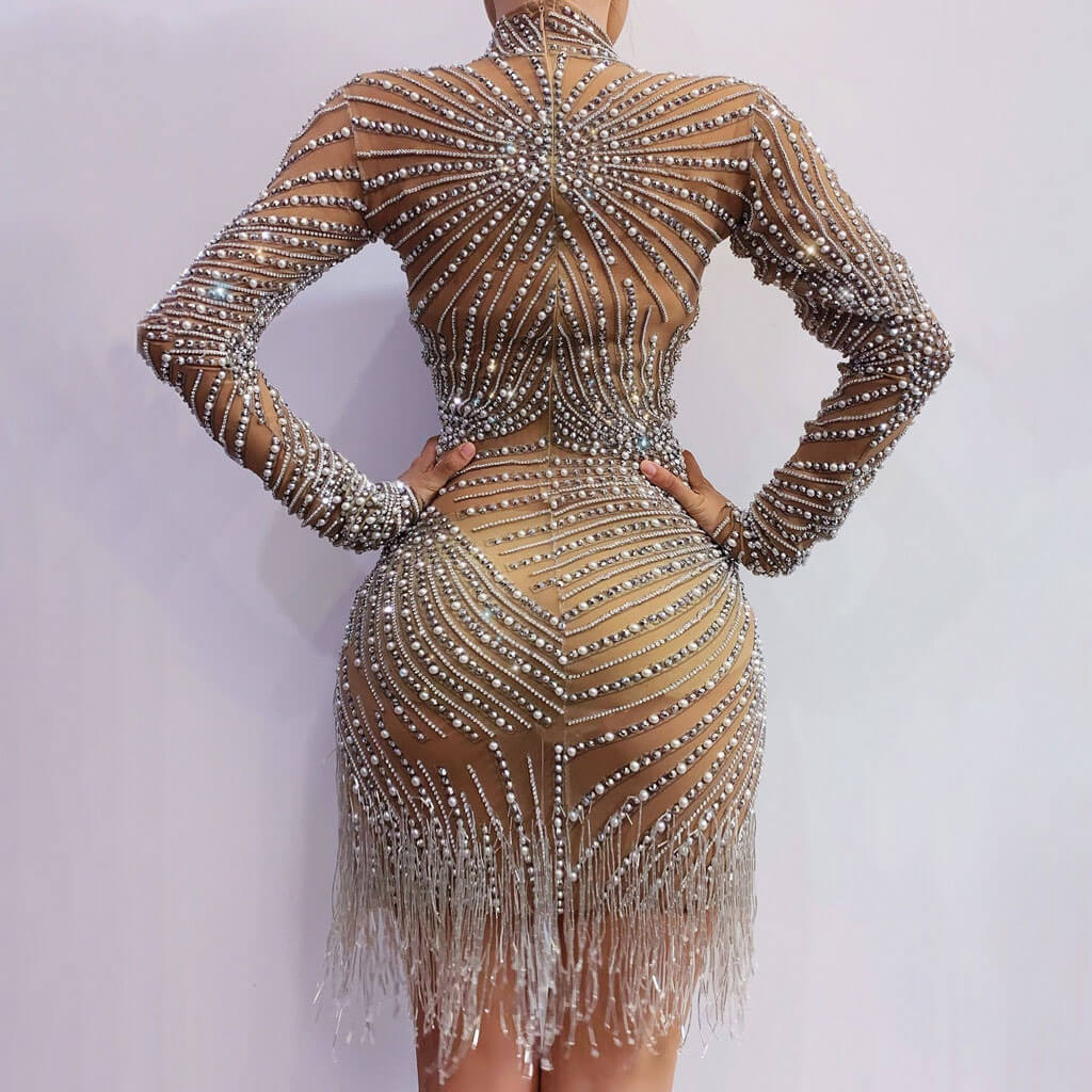 Sparkly Faux Pearl and Rhinestone Embellished Fringe Trim Split Side Mini Party Dress