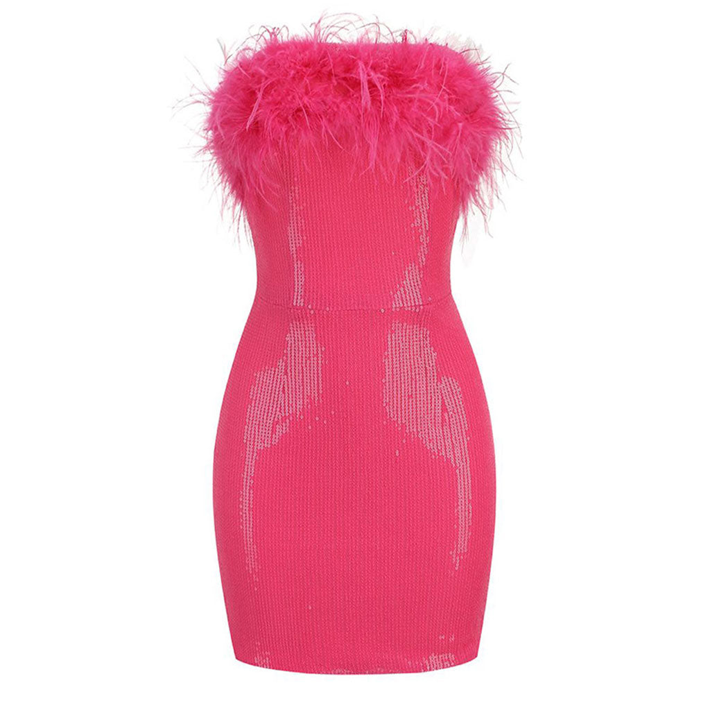 Sparkly Sequin Solid Color Feather Trim Strapless Bodycon Mini Party Dress