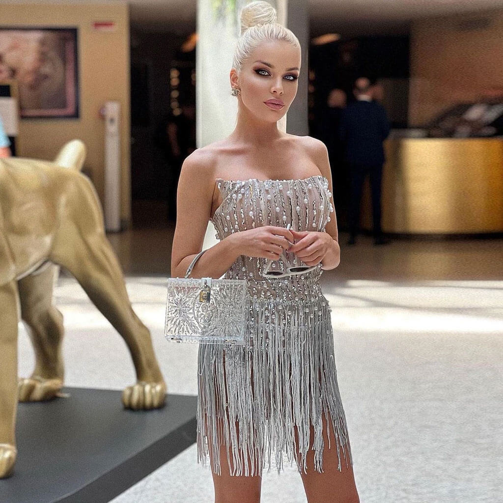 Sparkly Strapless Beaded Rhinestone Fringe Mini Dress - Beige
