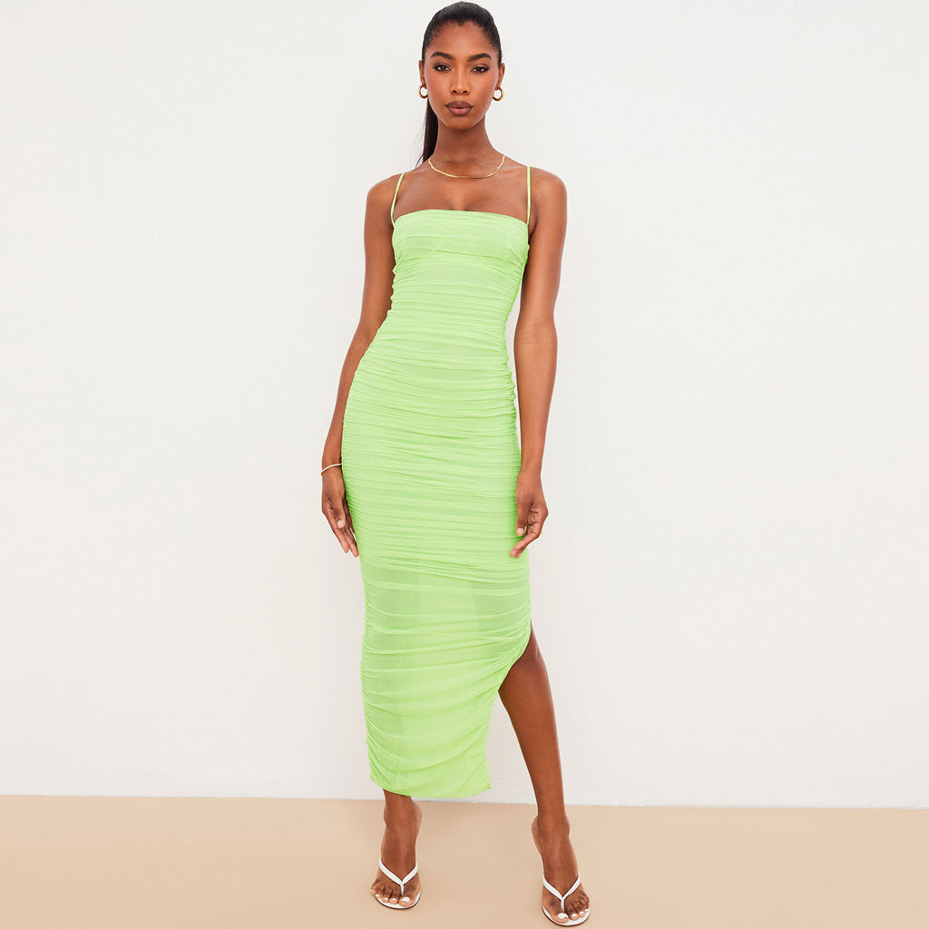 Square Neck High Slit Ruched Mesh Cocktail Party Maxi Dress - Green