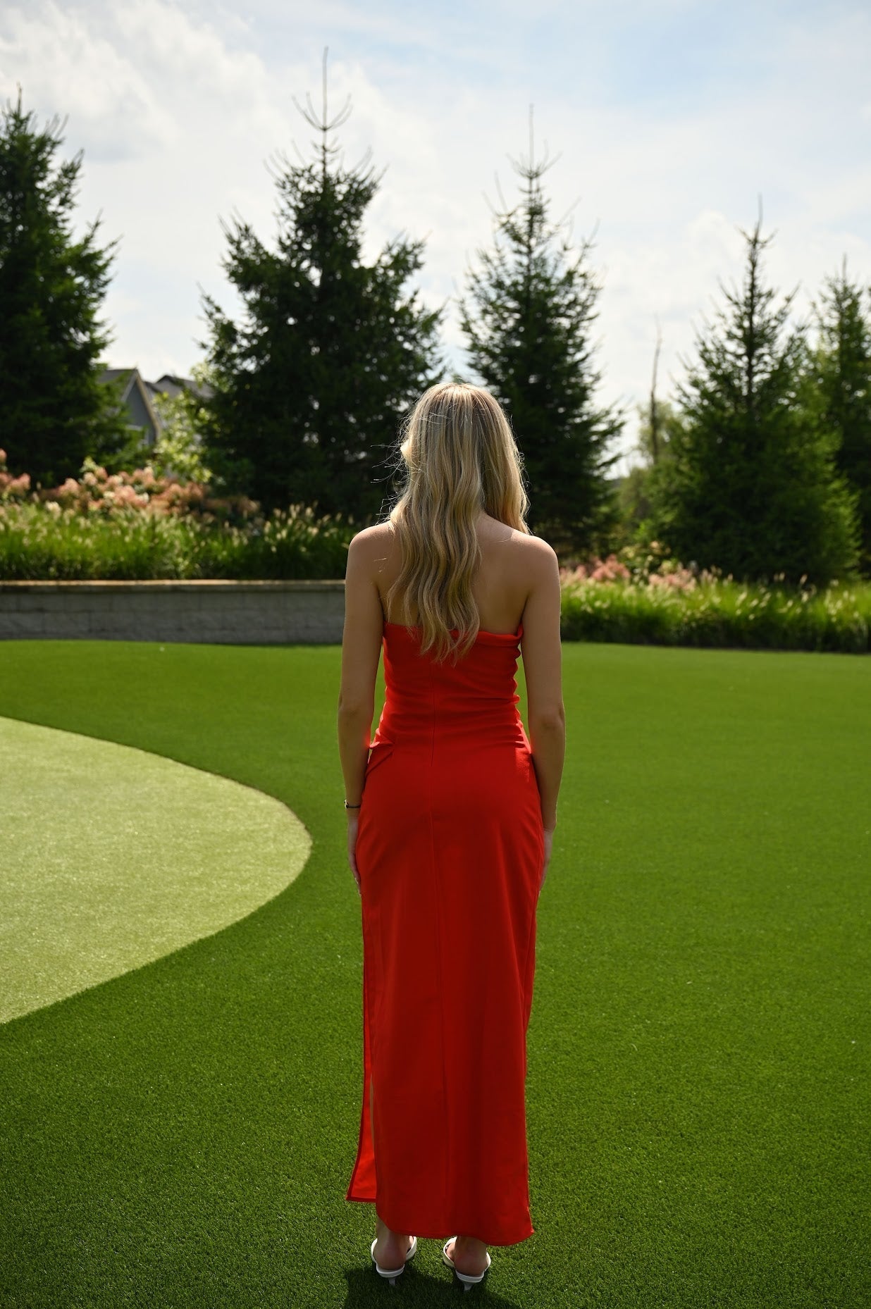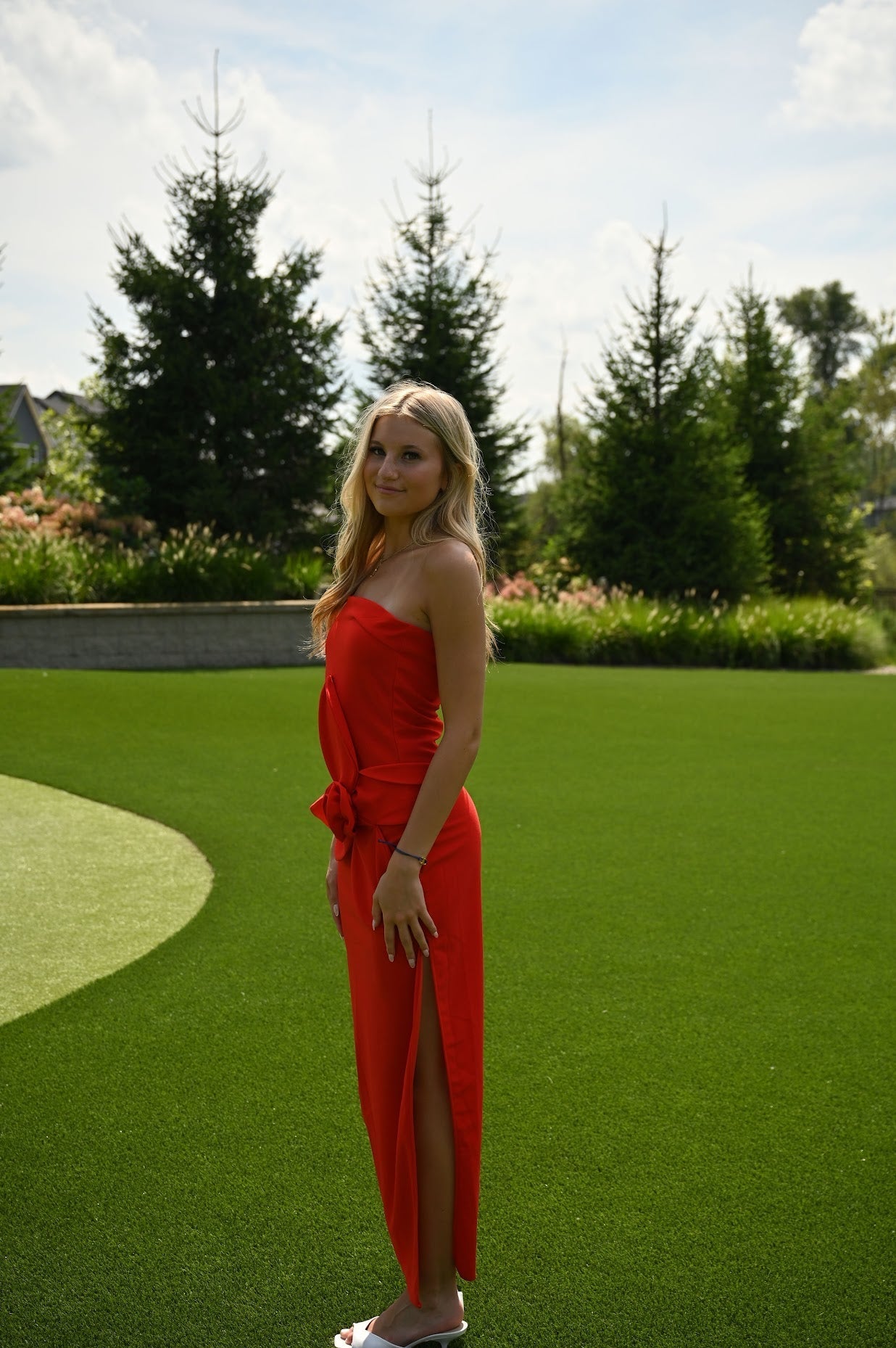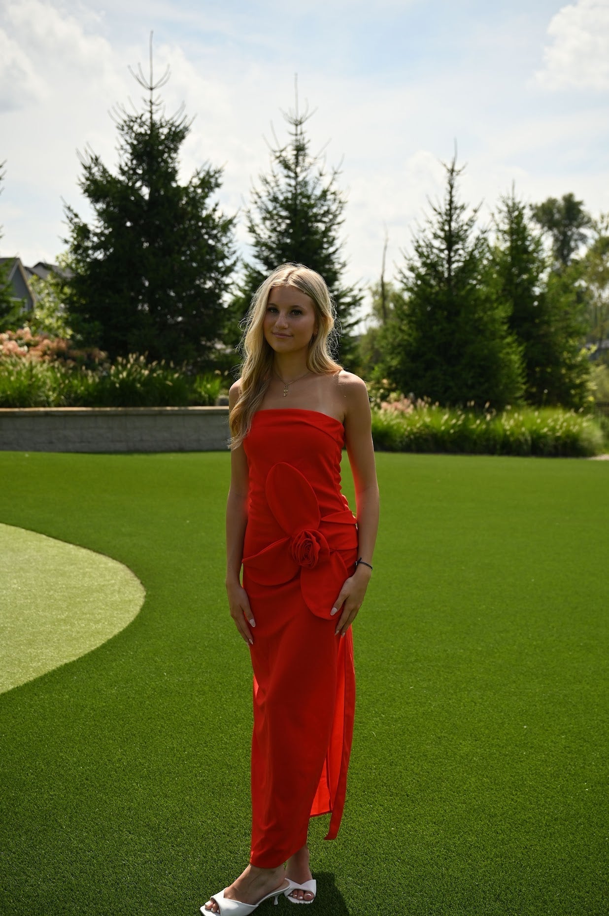 Be the center of attention in our Tulip Dress! This playful Tube Maxi Dress comes with an oversized flower patch, adding a touch of whimsy to your outfit. Perfect for any occasion, this dress will have you feeling confident and chic. (Seriously, it's blooming amazing!)