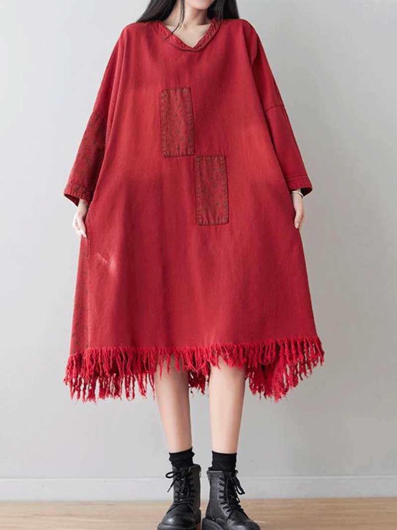 Two in love Denim Patch-Work Style Double Side Pockets Midi Dress