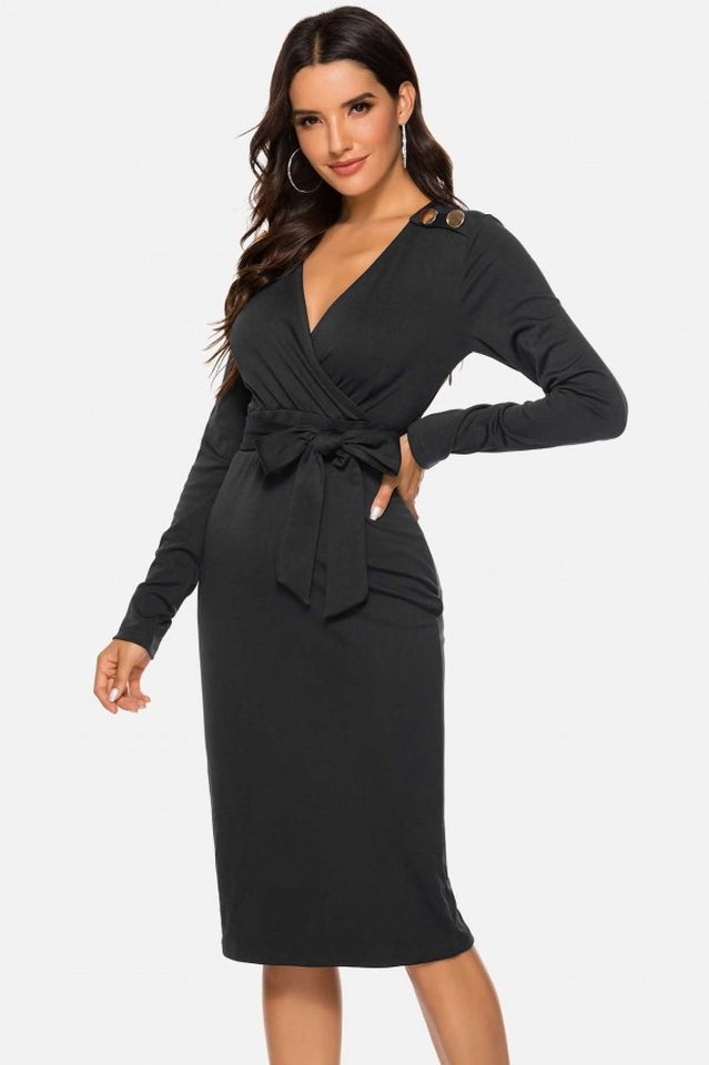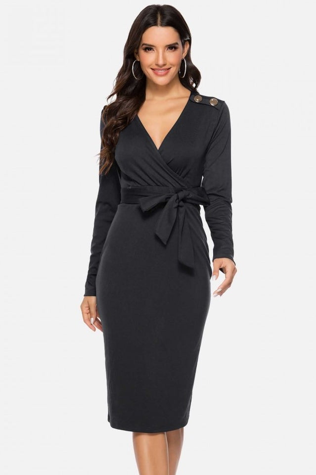 V Neck Wrap Tied Waist Slit Dress