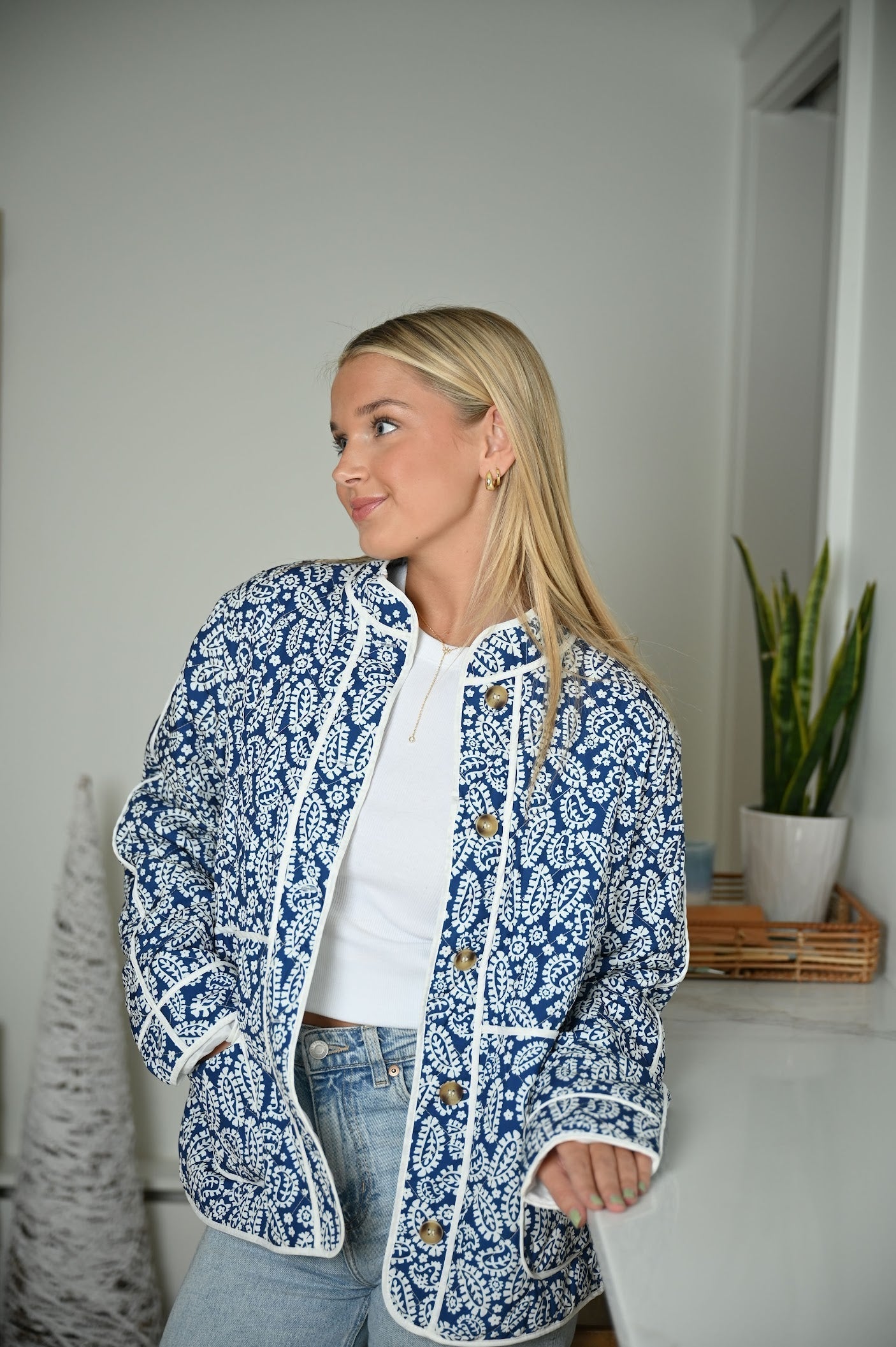 Wrap yourself in playful style with our Blue Paisley Jacket. This blue quilted jacket is perfect for adding some fun to your wardrobe while also keeping you warm. Stand out from the crowd with this quirky and unique jacket!