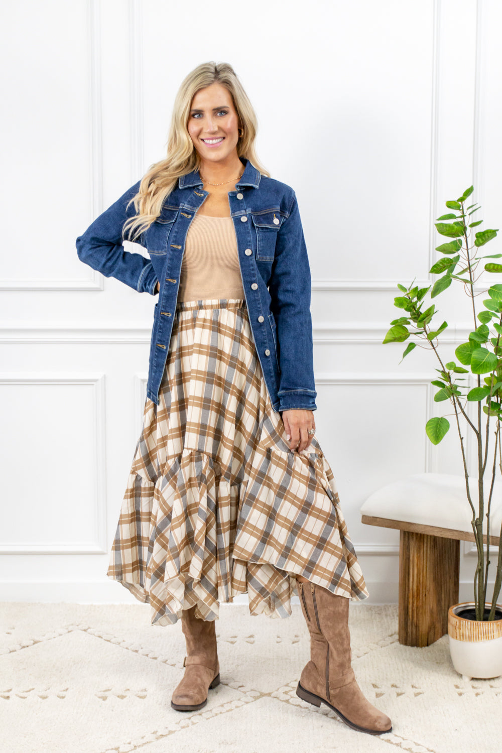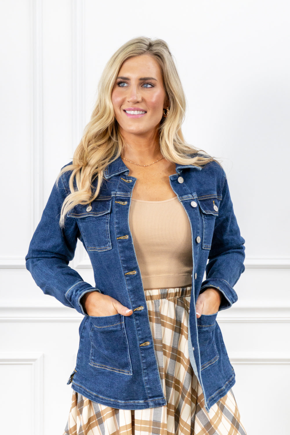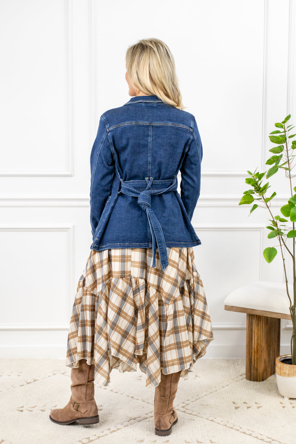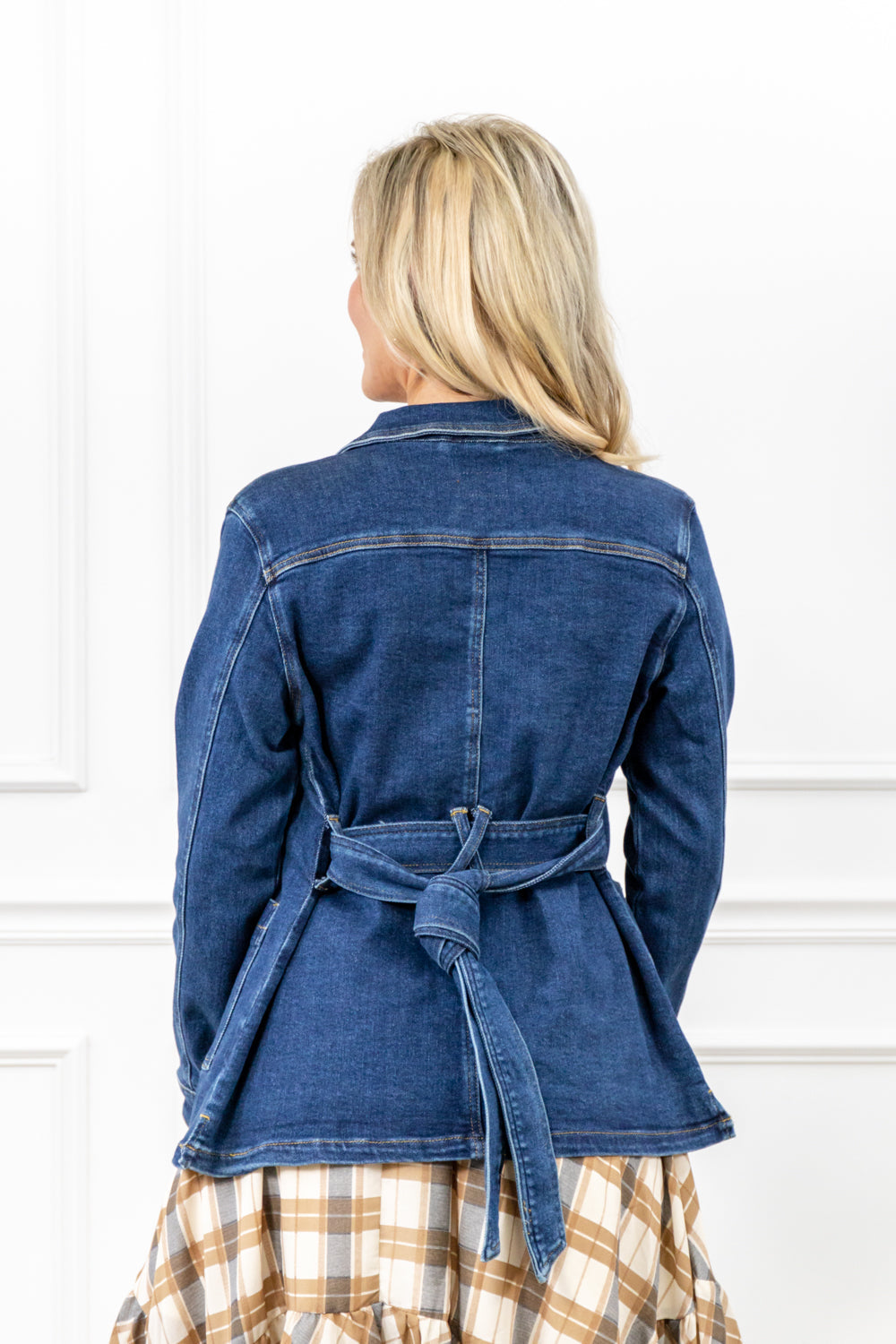 This classic denim jacket offers endless styling possibilities with its timeless dark wash and versatile mid-length design. The soft, stretchy denim and true-to-size fit ensure comfort and ease of movement, while the detachable belt allows for a customizable look. Whether you're layering it over your favorite outfit or pairing it with a skirt, this jacket is a must-have for any wardrobe.