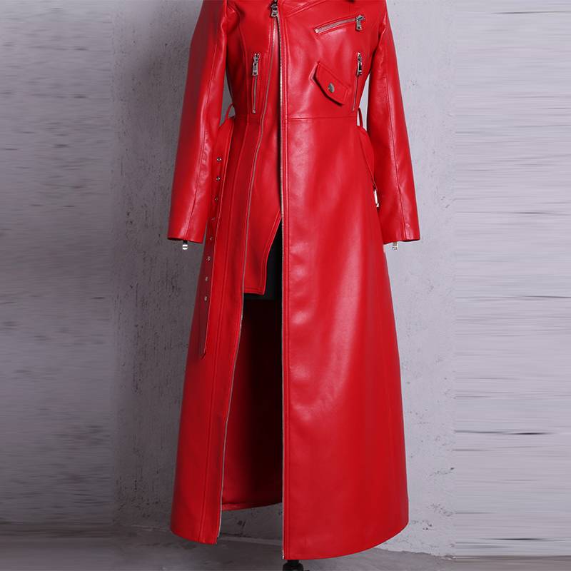 Featuring a slash neck design that is perfect for layering. This PU leather coat is easy to wear because of the zipper closure.  The belt, zipper, and a metal plate is a perfect decoration to this coat.
