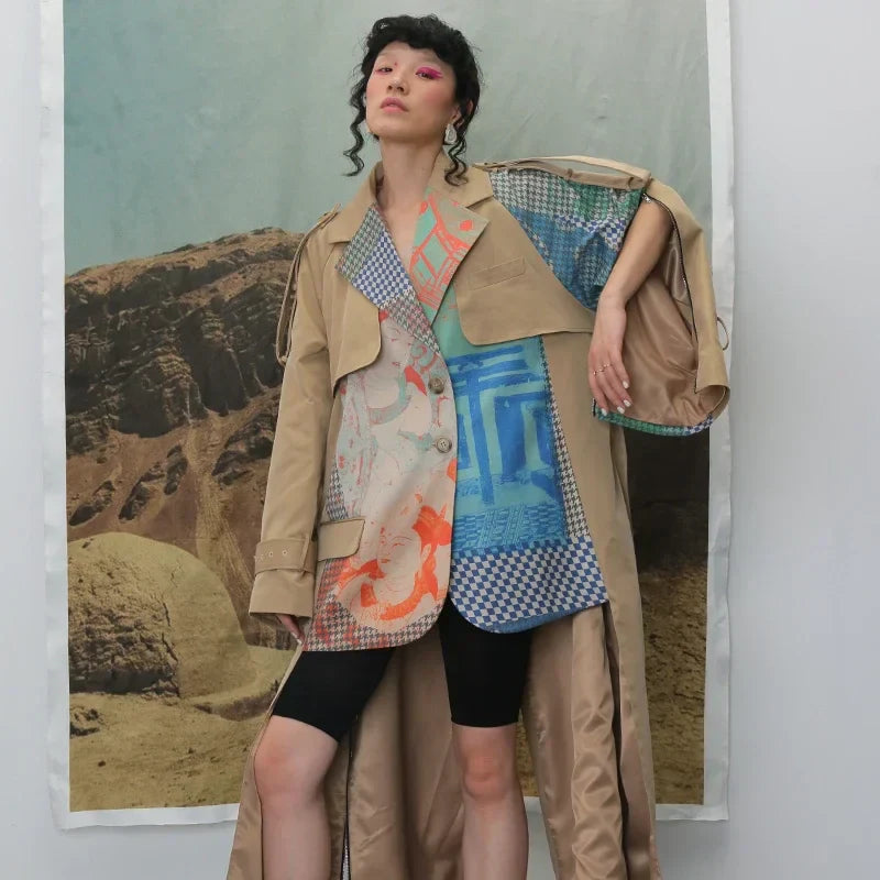 Be effortlessly stylish and on-trend with the Vibes In Motion Trench Coat. Made from a blend of cotton and polyester, this double-breasted coat features a unique spliced decoration and bold print pattern. With full-length sleeves, it's perfect for cooler weather and will make you stand out in any crowd.