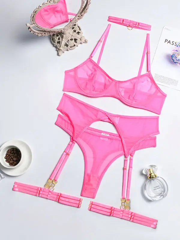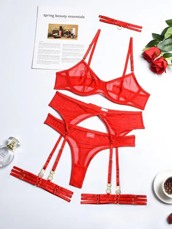 Get ready for some holiday romance with this 4 piece garter set! The mesh design adds a touch of seduction, while the adjustable straps ensure the perfect fit. Complete with a matching thong, you'll feel flirty and festive in this set. (Sleigh bells sold separately.)