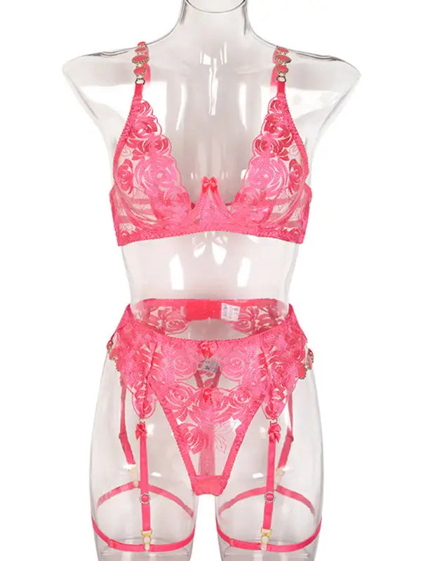 Roses Are Red - Embroidered 3-Pieces Garter Lingerie Set